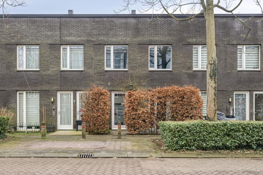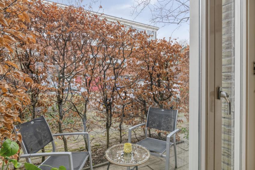The southwest-facing back garden allows you to fully enjoy the afternoon and evening sun. The garden is neatly paved and low-maintenance – a lovely place to relax or enjoy outdoor seating. At the rear is a wooden shed, ideal for bicycles and garden tools. From the garden, you also have direct access to the private parking space, located directly behind the garden. The front garden enjoys beautiful morning sunshine, a perfect spot for a cup of coffee to start the day peacefully. A charming detail is the birdhouse, where great tits regularly find their nest.