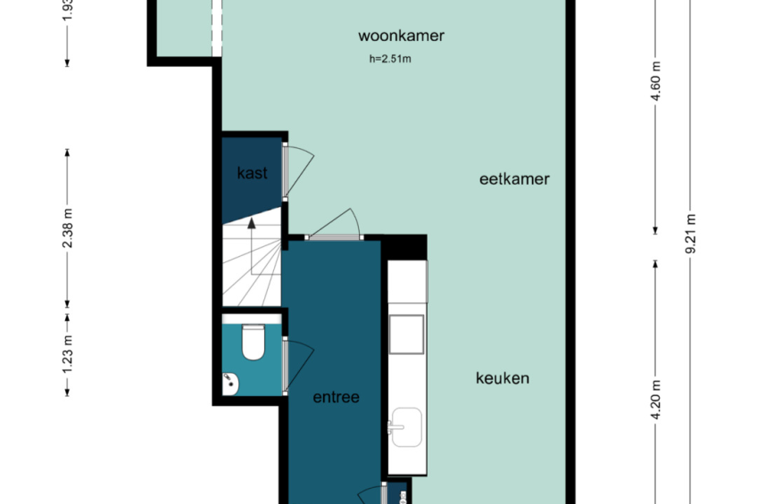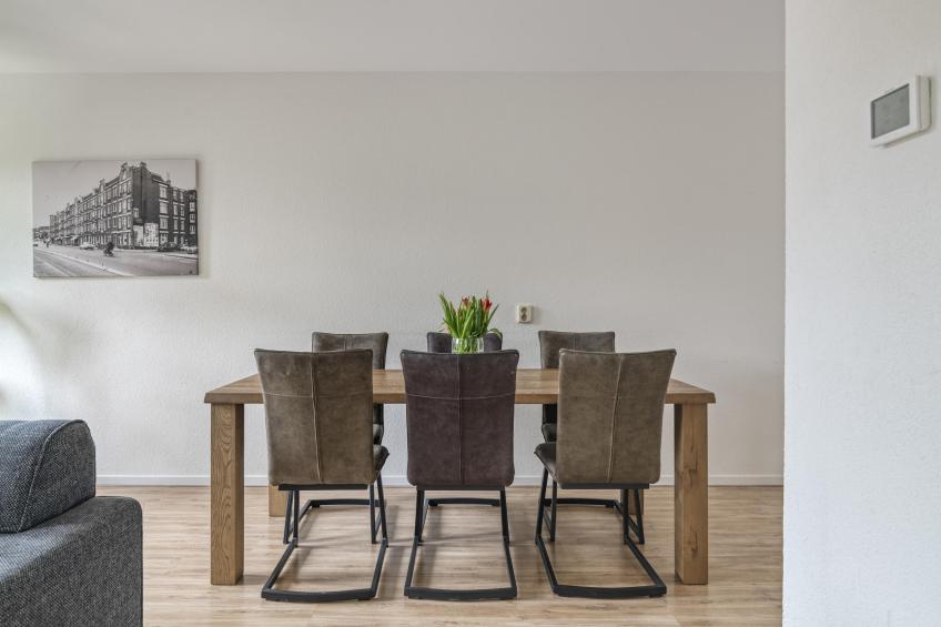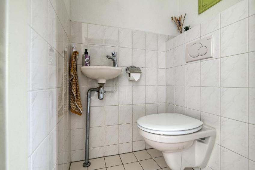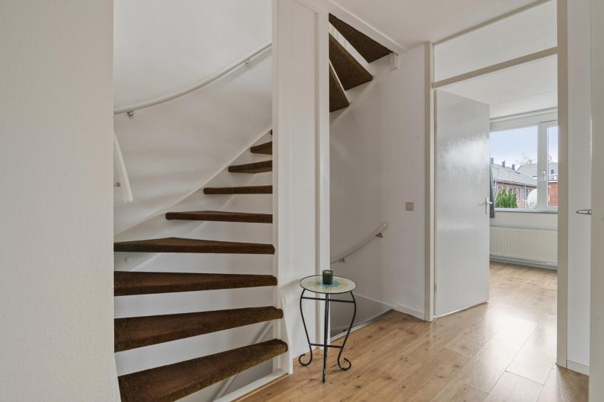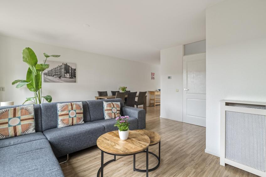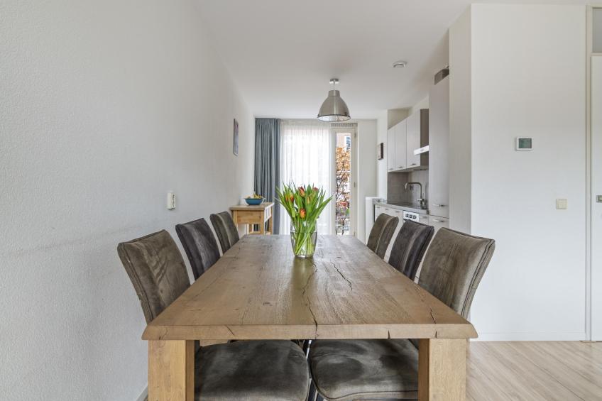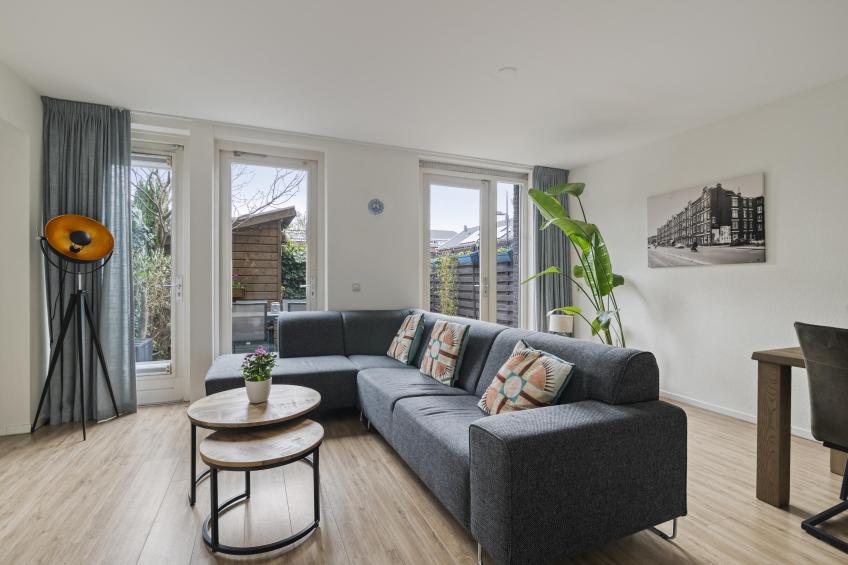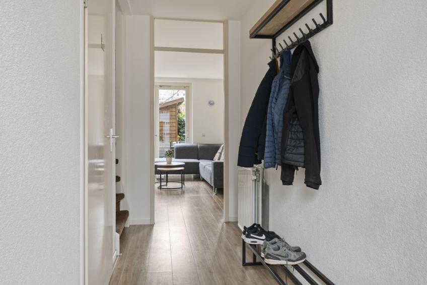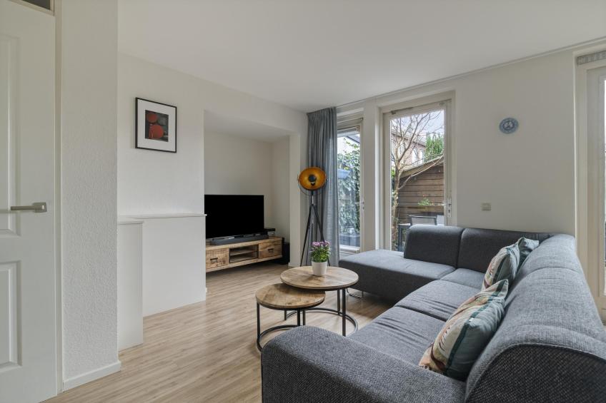 U komt binnen in een verzorgde hal met de meterkast en apart toilet met fonteintje. Vanuit hier loopt u door naar de woonkamer, waar direct het fijne, lichte karakter van de woning opvalt. De woonkamer is ruim en sfeervol, met meerdere openslaande deuren naar de zonnige achtertuin. Daarnaast beschikt de woonkamer over een ruime bergkast, perfect voor extra opslag. De gehele woning is voorzien van een nette laminaatvloer.
