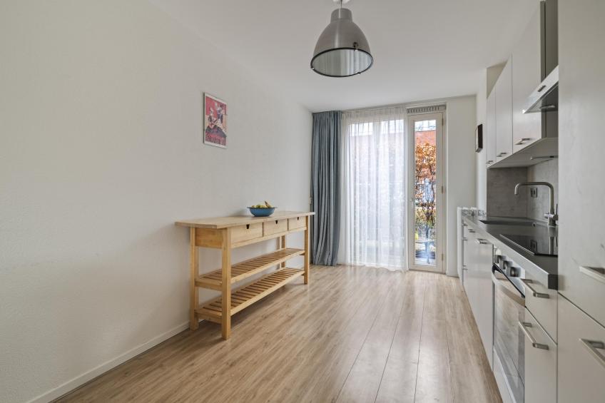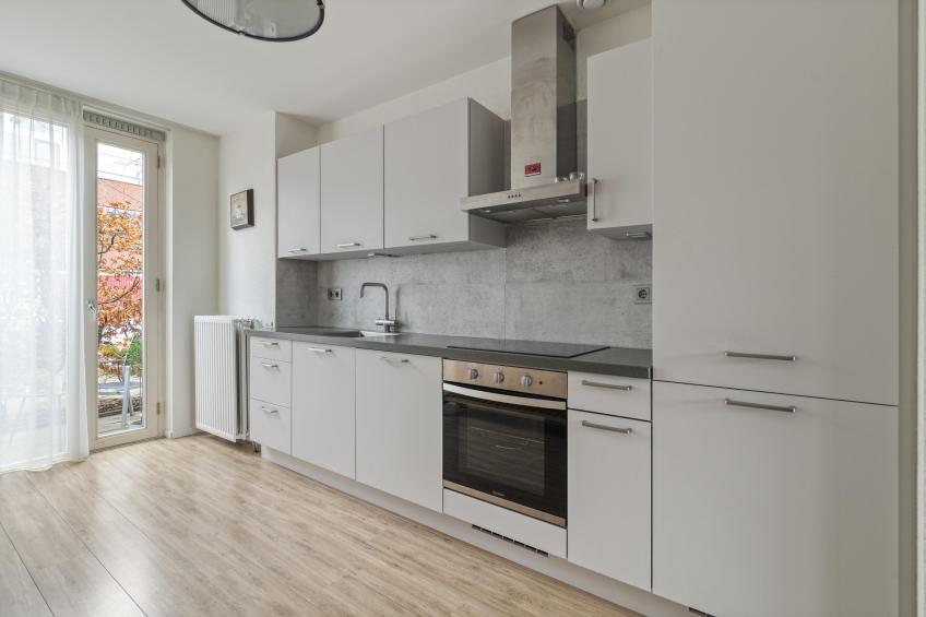 Aan de voorzijde van de woning ligt de keuken. Deze is uitgevoerd in een tijdloze grijstint met een stijlvol composieten aanrechtblad en voorzien van diverse inbouwapparatuur, zoals een vaatwasser, inductie kookplaat, afzuiger, oven en koel-vriescombinatie. De hoge ramen zorgen voor veel lichtinval en via de openslaande deur stapt u zo de voortuin in – een fijne plek voor een kop koffie in de ochtendzon.