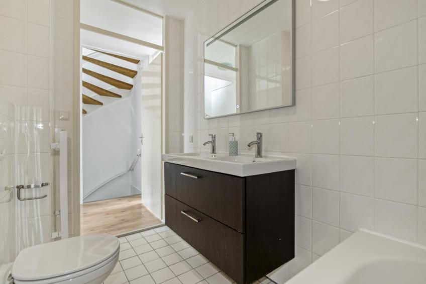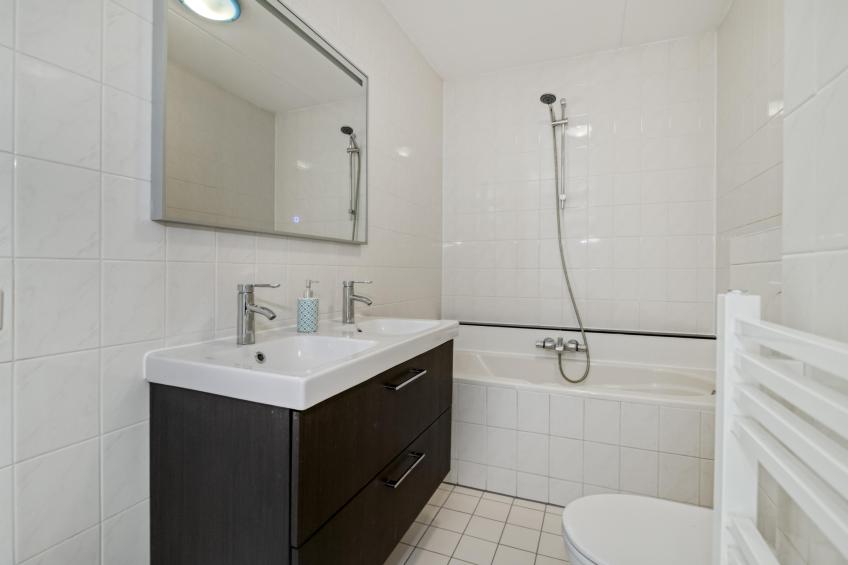 De nette badkamer bevindt zich centraal op de verdieping en is compleet uitgevoerd. U vindt hier een ligbad, een zwevend toilet, een dubbele wastafel met ladekast, een spiegel met verlichting en een handdoekenradiator.