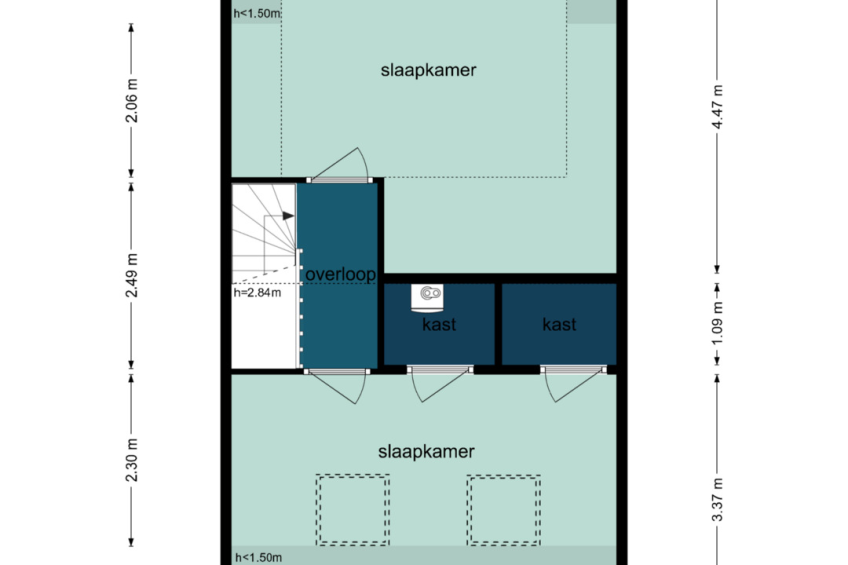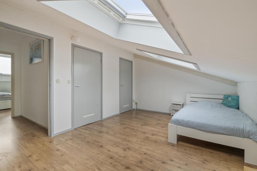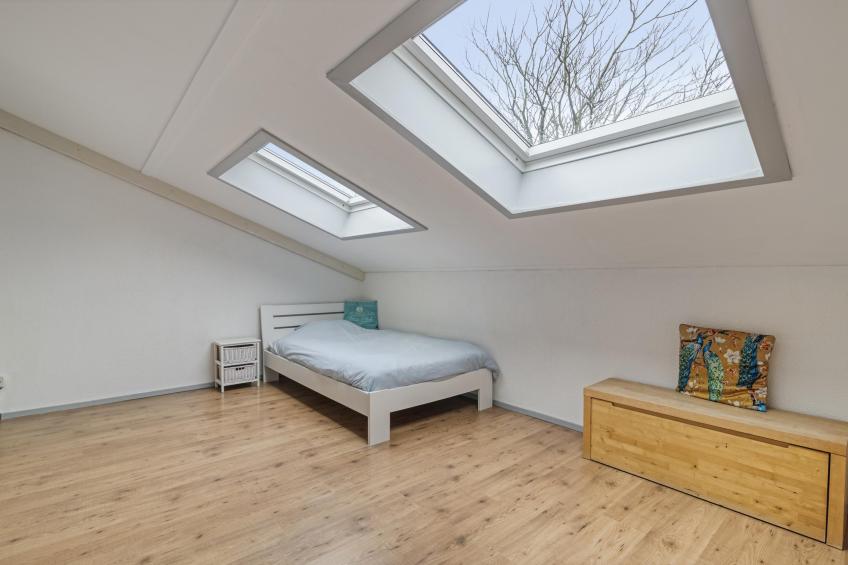 De tweede slaapkamer bevindt zich aan de voorzijde van de woning en is voorzien van twee grote dakramen, waardoor ook hier veel natuurlijk licht binnenvalt. Deze kamer beschikt over twee vaste bergkasten, waarin onder andere de opstelling van de cv-ketel en de aansluitingen voor de wasmachine en droger zijn geplaatst. Alles netjes en efficiënt weggewerkt.