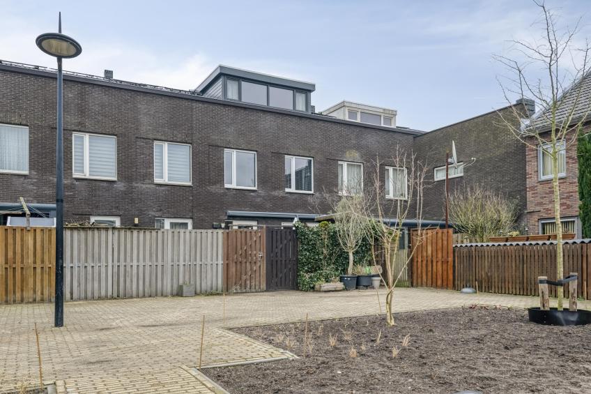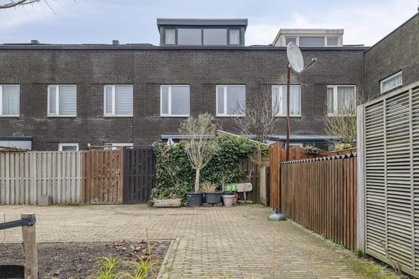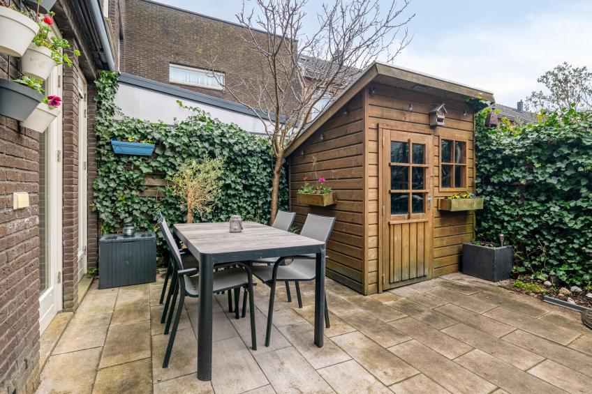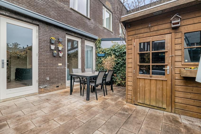 De achtertuin is gelegen op het zuidwesten, waardoor u hier volop van de middag- en avondzon geniet. De tuin is netjes betegeld en onderhoudsvriendelijk aangelegd – een fijne plek om te ontspannen of gezellig buiten te zitten. Achterin bevindt zich een houten berging, ideaal voor fietsen en tuingereedschap. Vanuit de tuin heeft u bovendien direct toegang tot de eigen parkeerplaats, die direct achter de tuin is gelegen.