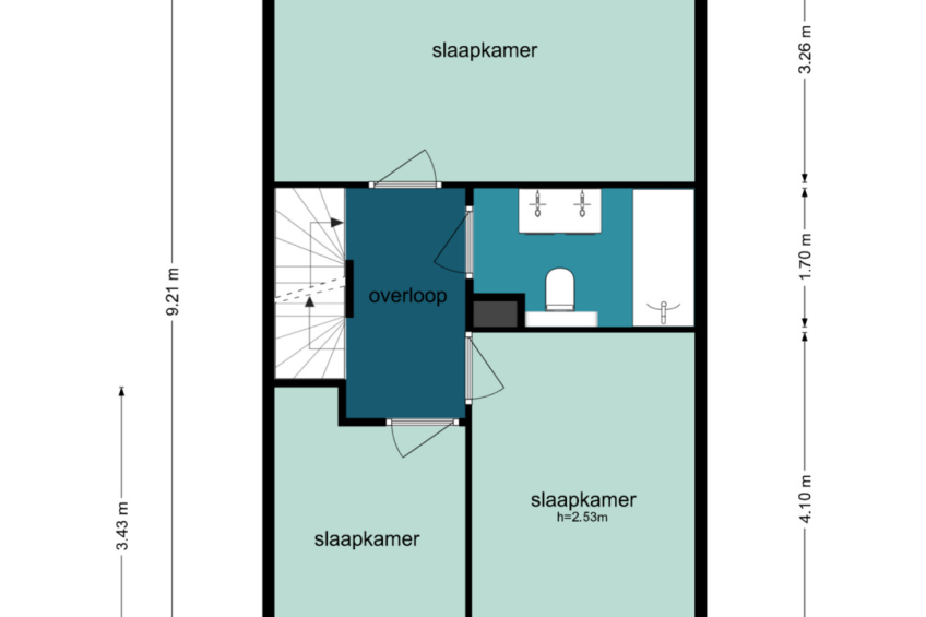 Via de vaste trap bereikt u de eerste verdieping. Hier bevinden zich drie ruime slaapkamers en de badkamer.