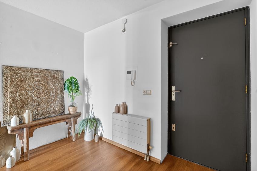 The central entrance leads to the elevator on the third floor, where this well-maintained apartment is located. The apartment features a spacious entrance hall with a practical storage cupboard housing the central heating boiler and a separate toilet with a hand basin. From the hallway, you access the first bedroom, a pleasant and bright, good-sized room. Adjacent to this room is an additional storage unit, ideal for storage. Adjacent to this bedroom is the second spacious bedroom, also comfortably sized and multifunctional.