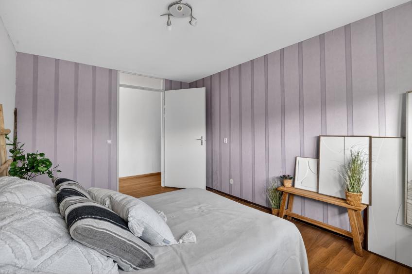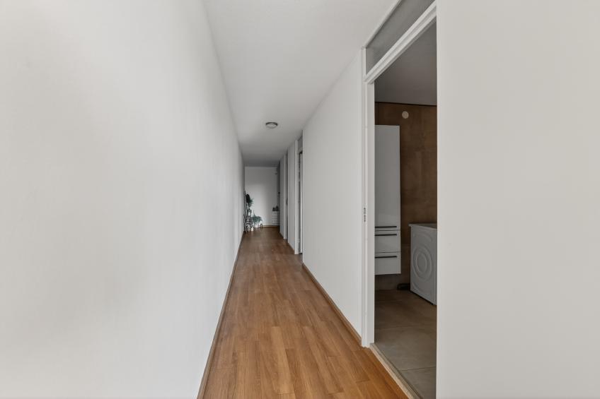 Via de centrale entree bereikt u met de lift de derde verdieping, waar dit goed onderhouden appartement is gelegen. De woning beschikt over een ruime entree, met een praktische bergkast waarin de cv-ketel is opgesteld, en een separaat toilet met fonteintje. Vanuit de gang heeft u toegang tot de eerste slaapkamer, een prettige en lichte kamer van goed formaat. Aansluitend bevindt zich hier een extra berging, ideaal voor opslag. Daarnaast ligt de tweede ruime slaapkamer, eveneens comfortabel van afmeting en multifunctioneel in te richten.
