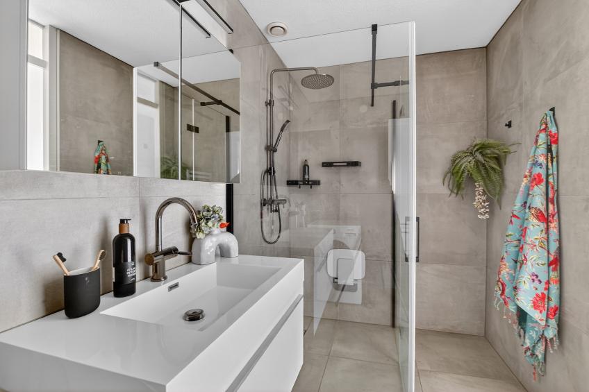 De moderne badkamer, uitgevoerd in een neutrale grijze kleurstelling, is voorzien van een inloopdouche, een wastafel met meubel, een handdoeken radiator én een wasmachineaansluiting.