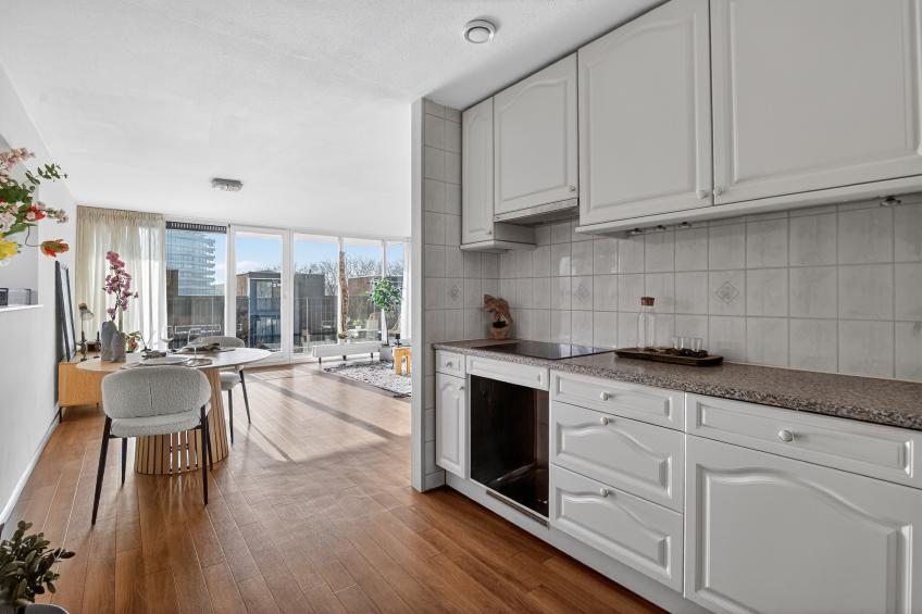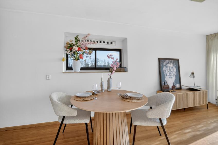 De lichte living vormt het centrale leefgedeelte van de woning en biedt toegang tot het zonnige terras over de volledige breedte, gunstig gelegen op het zuiden. Hierdoor geniet u hier van veel daglicht en een aangename buitenruimte. De halfopen keuken sluit aan op de woonkamer en is functioneel en eenvoudig ingericht.