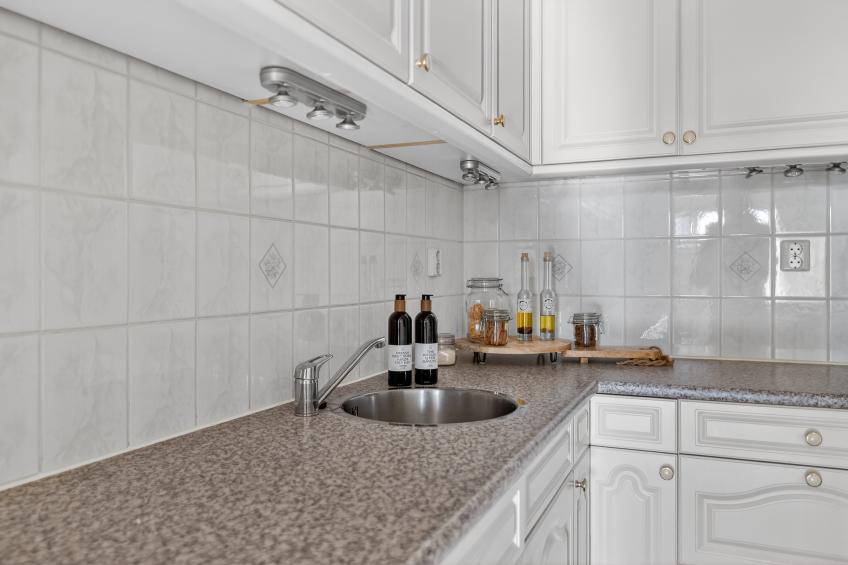 The bright living room is the central living area of ??the house and opens onto the sunny terrace spanning the entire width of the house, conveniently facing south. This allows you to enjoy abundant natural light and a pleasant outdoor space. The semi-open kitchen connects to the living room and is functional and simply furnished.
