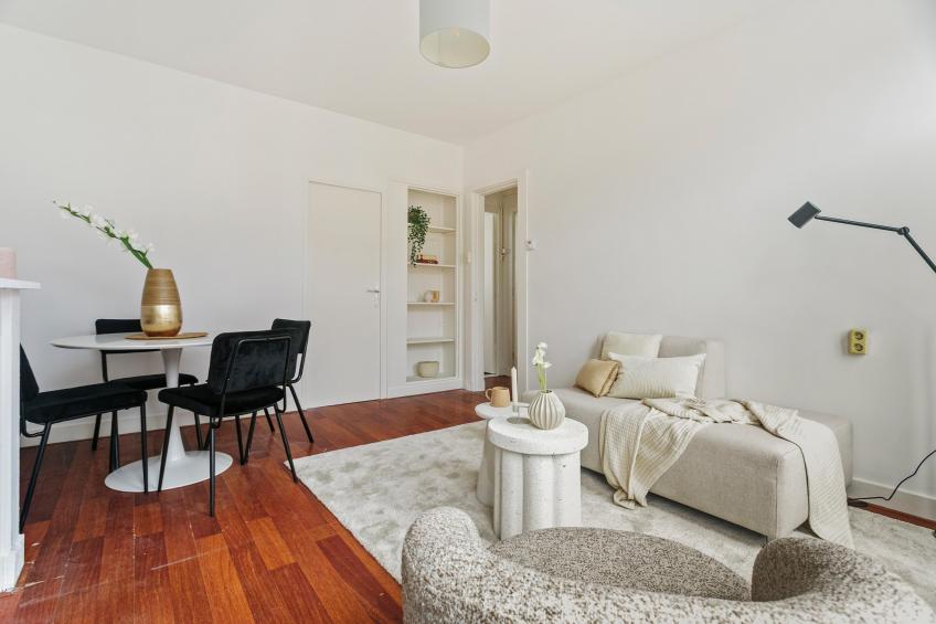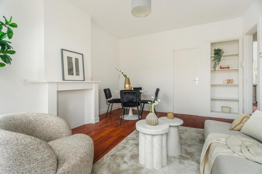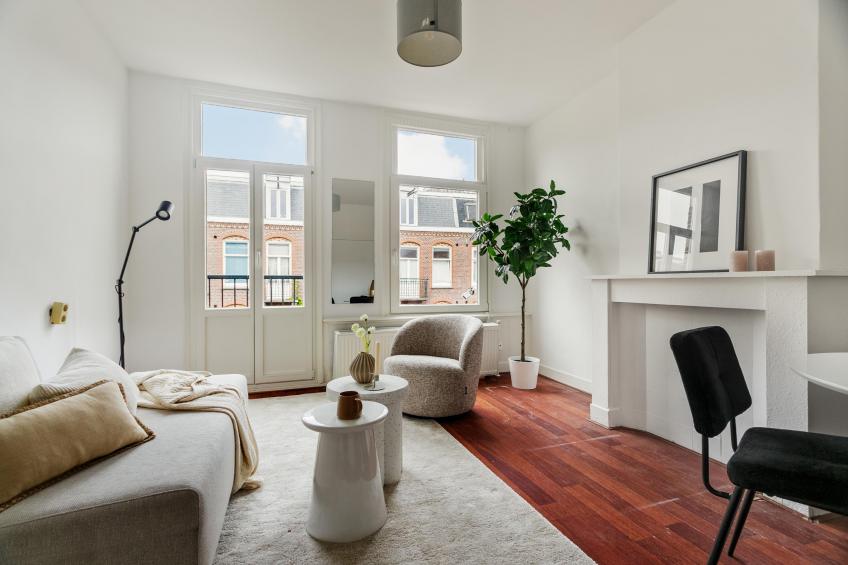 Het appartement beschikt over een lichte woonkamer met toegang tot een Frans balkon, een dichte keuken, twee slaapkamers en een zonnig balkon op het zuiden. De tweede slaapkamer is flexibel in te delen, bijvoorbeeld als thuiswerkplek, logeerkamer of walk-in closet.