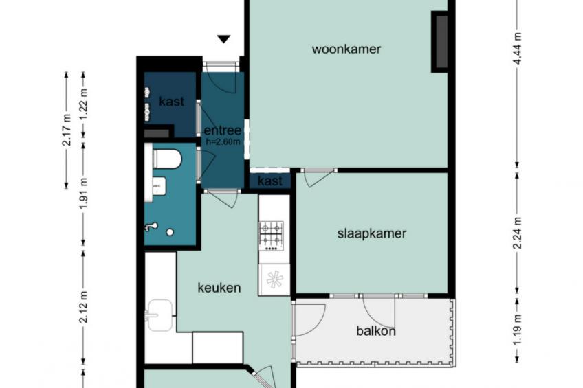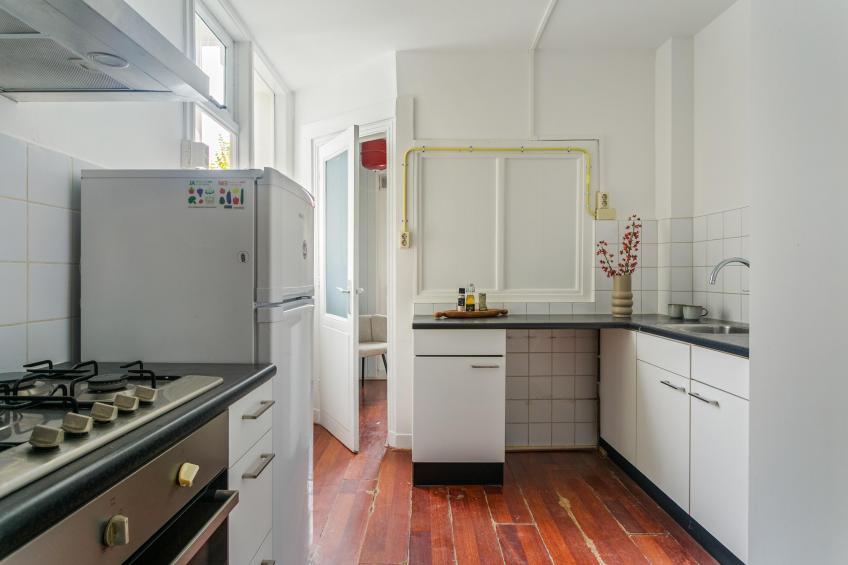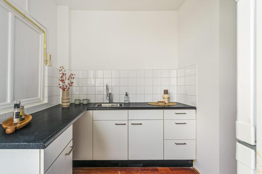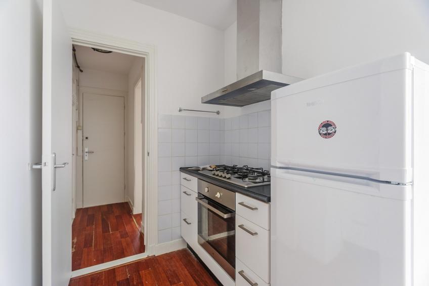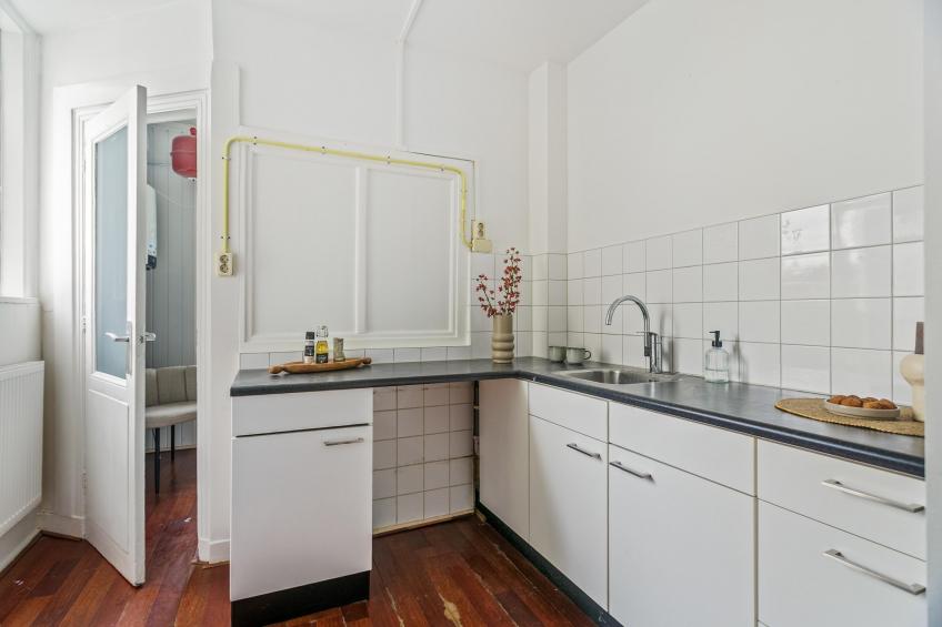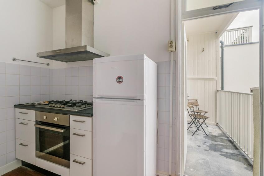 The kitchen is equipped with a 4-burner gas cooktop, oven, and refrigerator with freezer compartment. The neatly tiled bathroom has a spacious shower, sink, and wall-mounted toilet. In short: a wonderful apartment in a prime location in Amsterdam, with plenty of opportunities to create your own dream home!