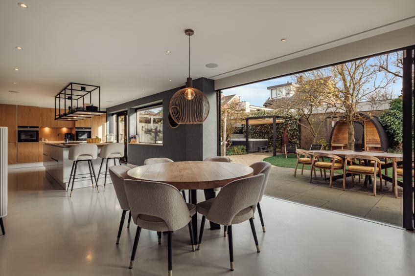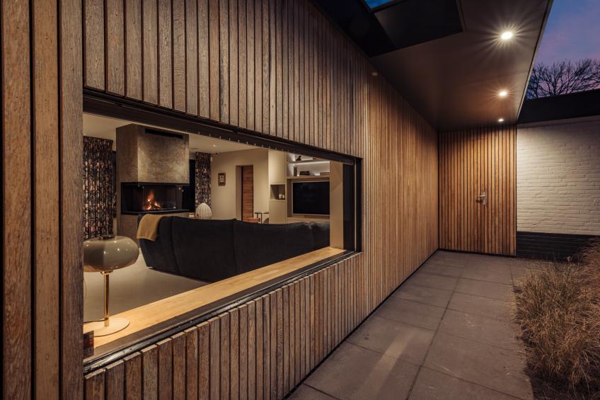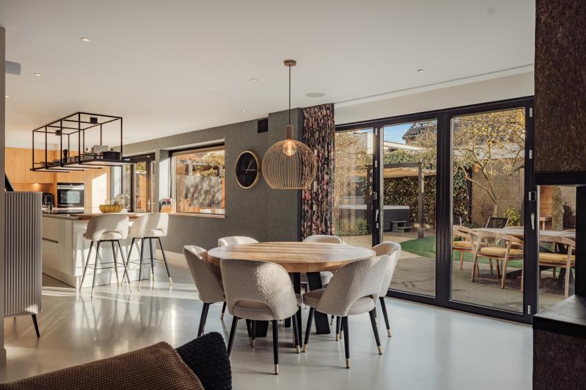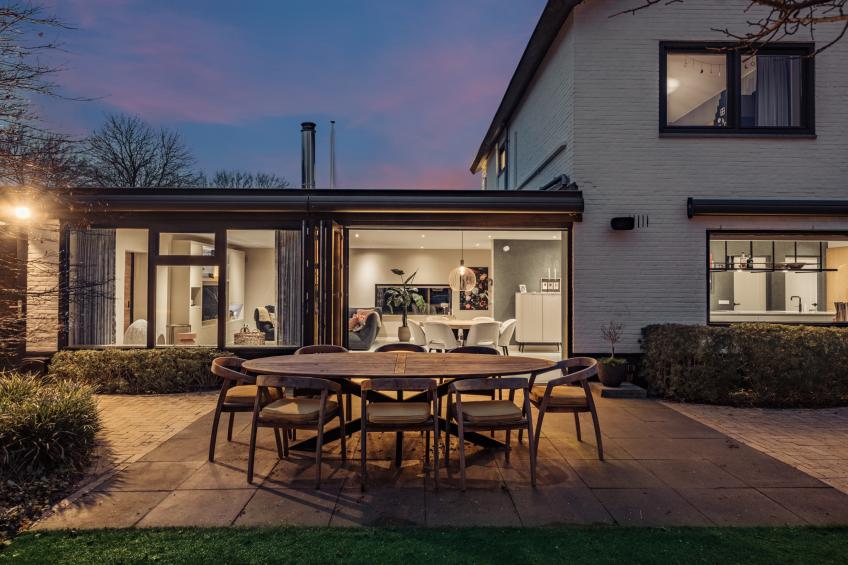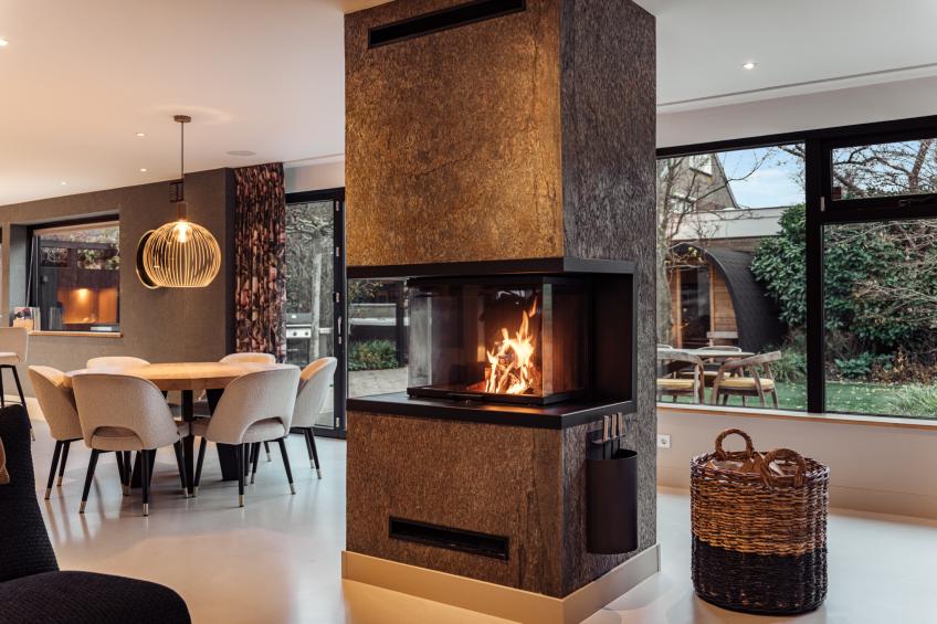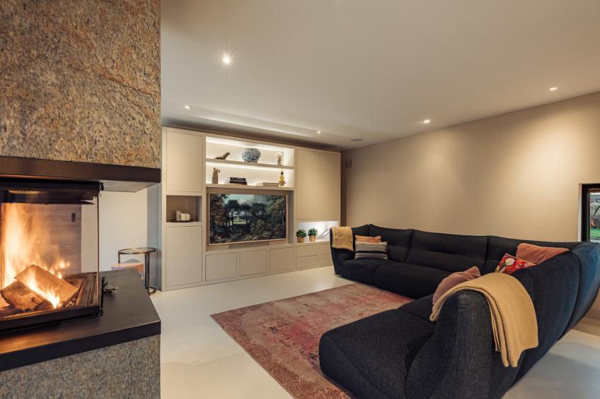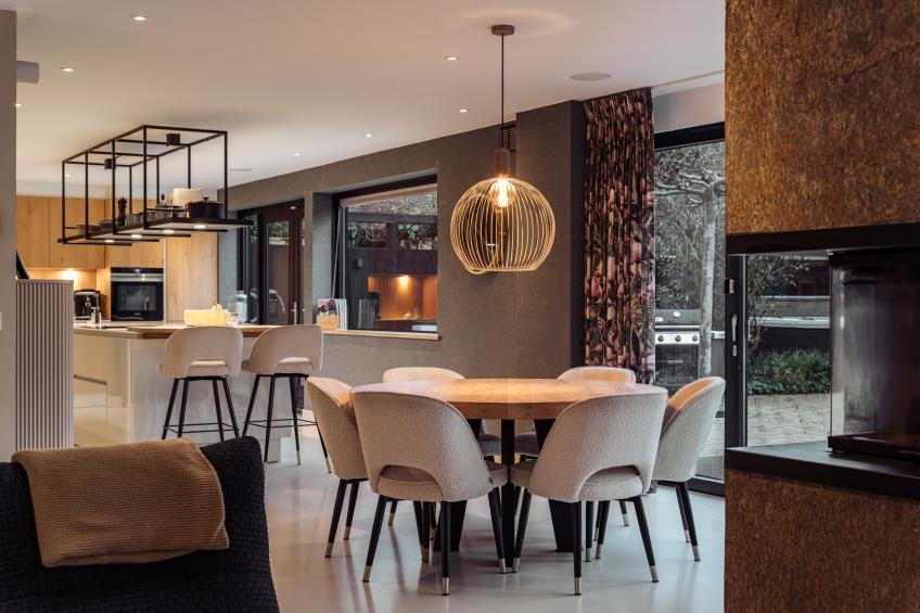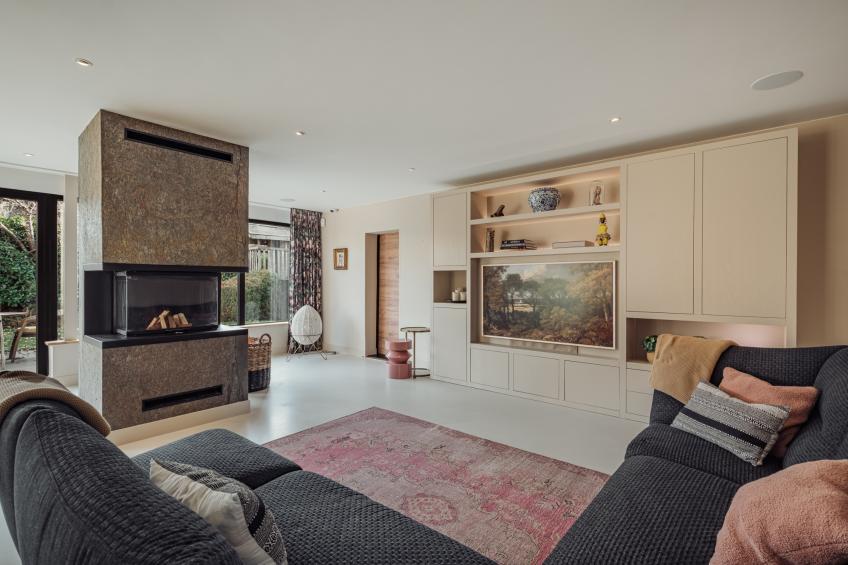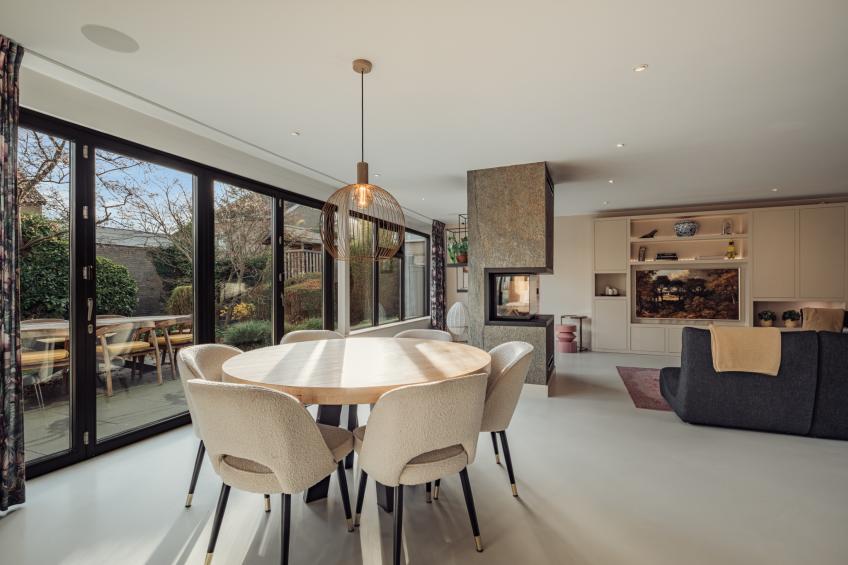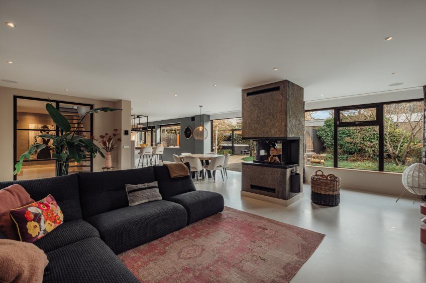 De woonkamer is een heerlijke, open leefruimte dankzij de grote raampartijen die het daglicht rijkelijk binnenlaten. De absolute blikvanger is de grote harmonicadeur, die volledig open te schuiven is en een directe, naadloze verbinding creëert met de fraai aangelegde achtertuin. De sfeervolle open haard van natuursteen vormt het warme middelpunt van de ruimte.