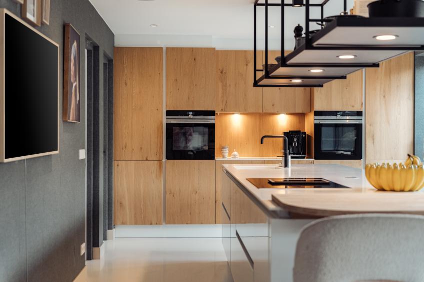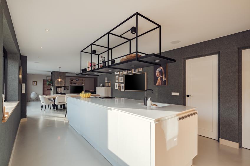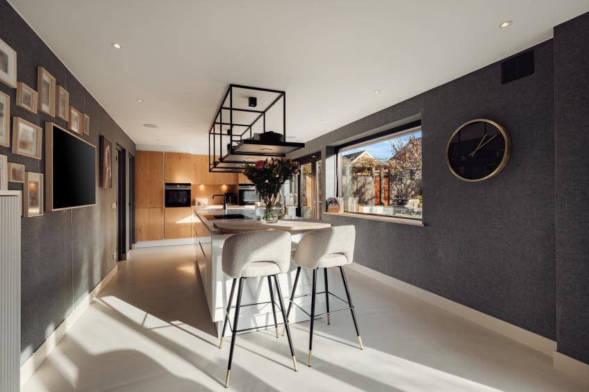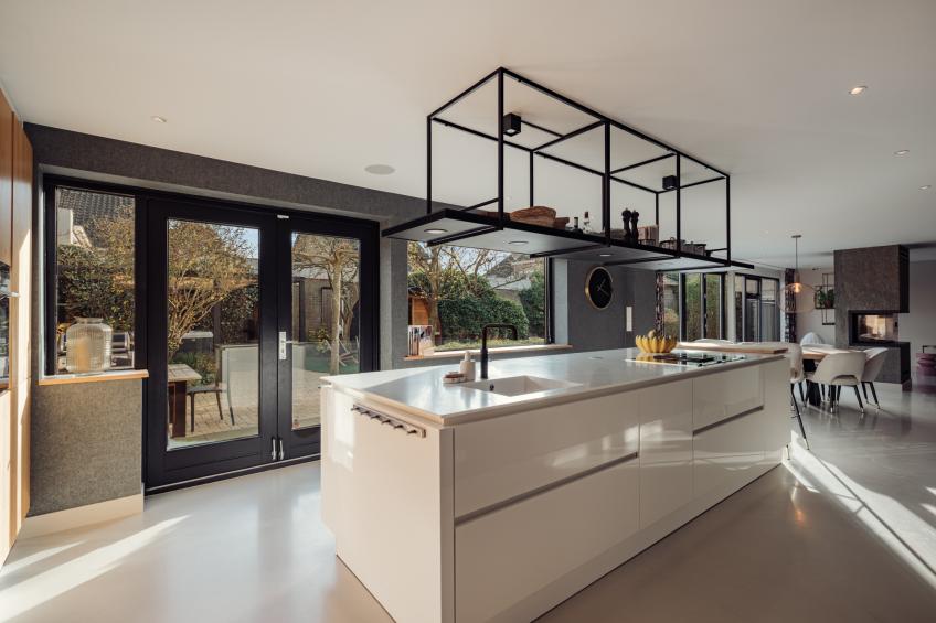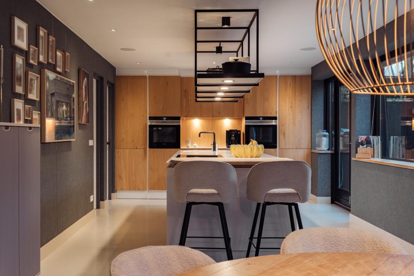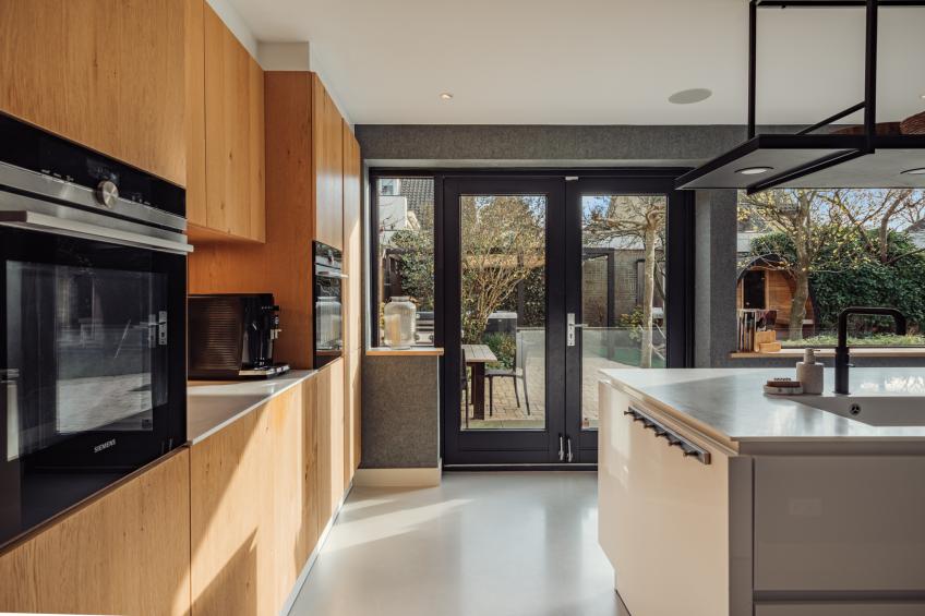 De aangrenzende leefkeuken is het culinaire en sociale hart van de woning. Het grote kookeiland is voorzien van een strak wit Corian keukenblad, gecombineerd met warme houten kasten, lades en een stalen etagère voor een luxueuze uitstraling. De keuken is uitgerust met hoogwaardige Siemens-inbouwapparatuur, waaronder een inductiekookplaat met geïntegreerde afzuiger, een combi-oven met stoomfunctie, een combi-oven met magnetronfunctie, een ruime koelkast, een vaatwasser en een Quooker. Vanuit de leefkeuken openen openslaande deuren direct naar de tuin, waardoor ook hier de verbinding tussen binnen en buiten optimaal is. De speelse bar en de praktische koffiecorner maken de keuken tot een fijne plek om samen te komen. De keuken is eveneens direct via de hal te bereiken.
