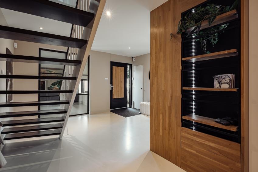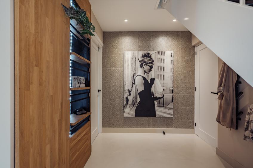 De royale hal vormt het stijlvolle begin van deze woonlaag. In de hal bevinden zich de meterkast met uitgebreide groepen (voorzien van glasvezel), een nette garderoberuimte met vaste kast en een modern toilet met zwevend closet en fonteintje, uitgevoerd in een rustige, natuurlijke kleurstelling. Vanuit de hal geven de zwarte taatsdeuren toegang tot de lichte en royale woonkamer. De gehele begane grond is voorzien van een lichte gietvloer met vloerverwarming, wat zorgt voor een strak, modern en uiterst comfortabel wooncomfort.