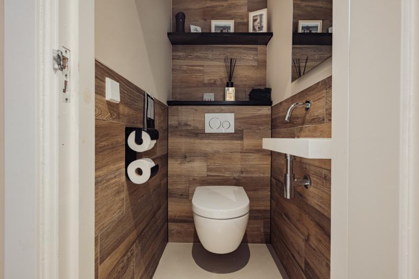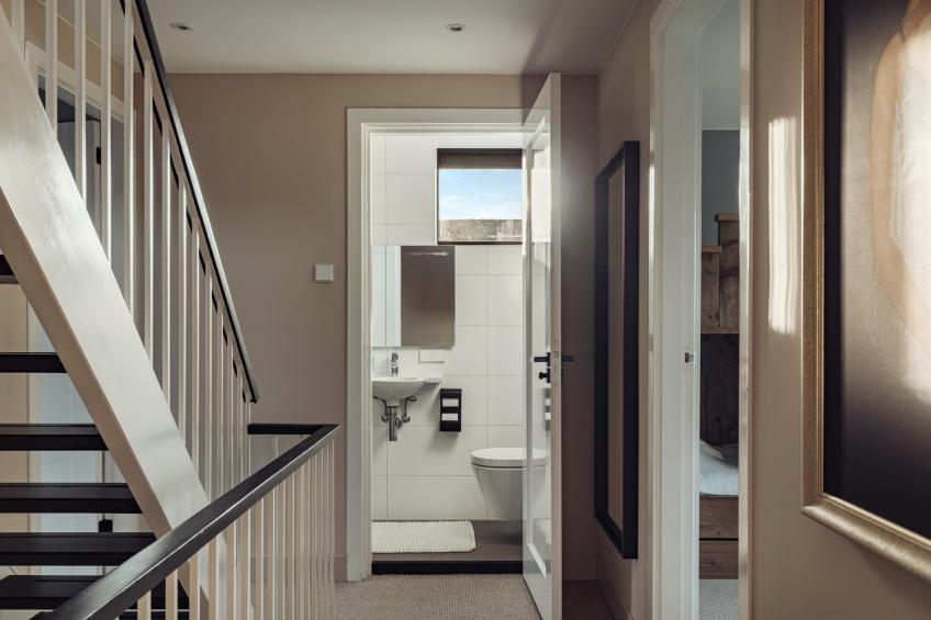 Als aangename verrassing bevindt zich op deze verdieping nog als extra een kleine badkamer, uitgerust met een douche (regen/handdouche), wastafel en een zwevend toilet.
