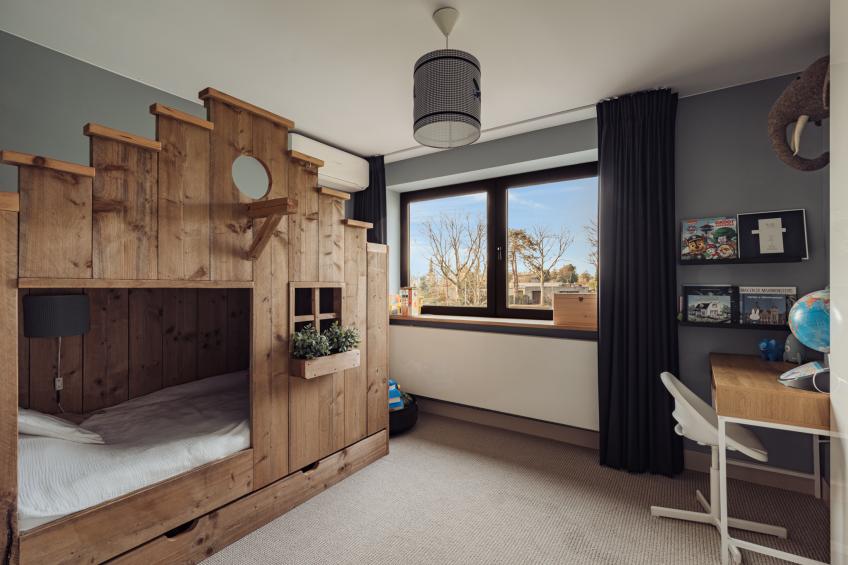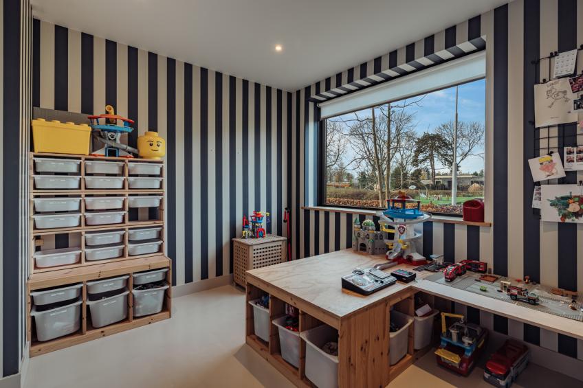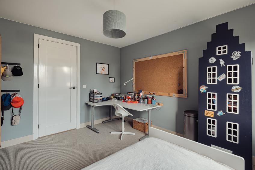 Aan de hal grenst bovendien de eerste slaapkamer, met uitzicht op het groene plantsoen aan de voorzijde. Deze kamer is multifunctioneel en wordt momenteel op een handige manier gebruikt als speelkamer — een ideale plek voor kinderen, maar ook uitstekend geschikt als slaapkamer, werkkamer, logeerkamer of hobbyruimte.