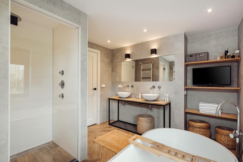 De extra royale, luxe en compleet uitgevoerde badkamer is een echte blikvanger. Uitgevoerd in warme grijs- en houtlook tinten straalt de ruimte rust en kwaliteit uit. De badkamer is voorzien van: