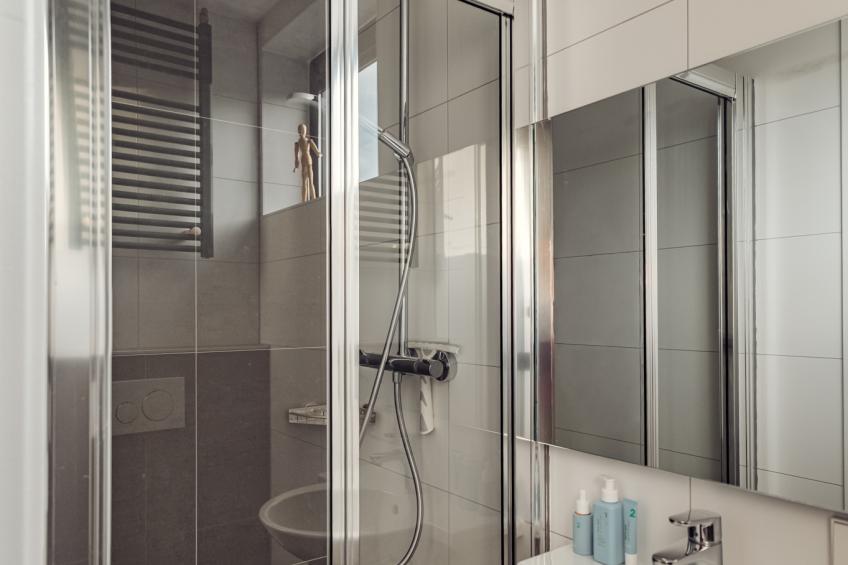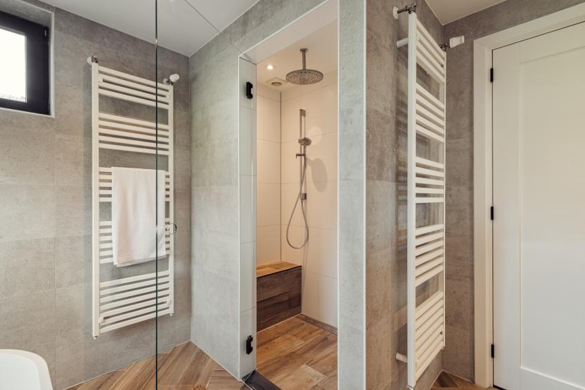 • Een ruime inloopdouche met regendouche, handdouche en een vast zitje