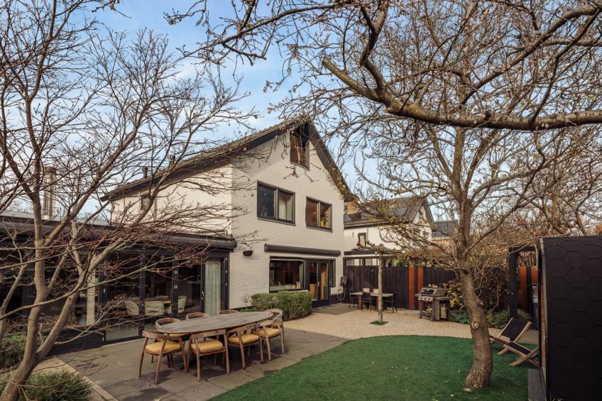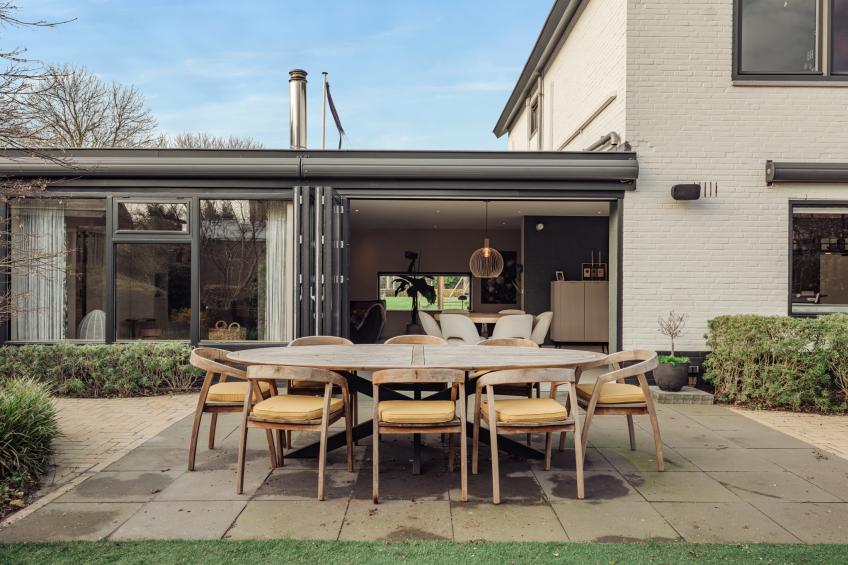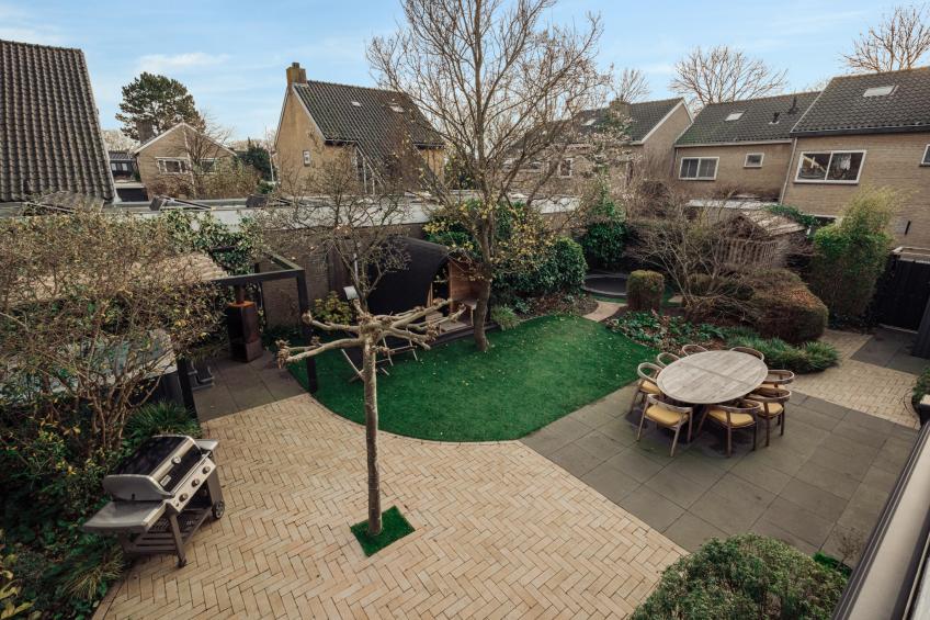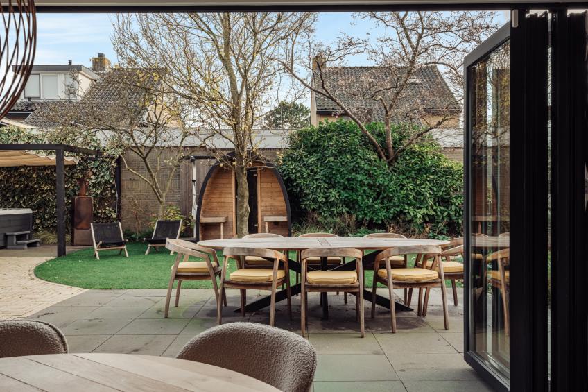 Het ruime terras biedt volop plek om te loungen, te dineren of gezellig samen te komen, terwijl het gedeeltelijke kunstgras zorgt voor een onderhoudsvriendelijk en strak geheel.