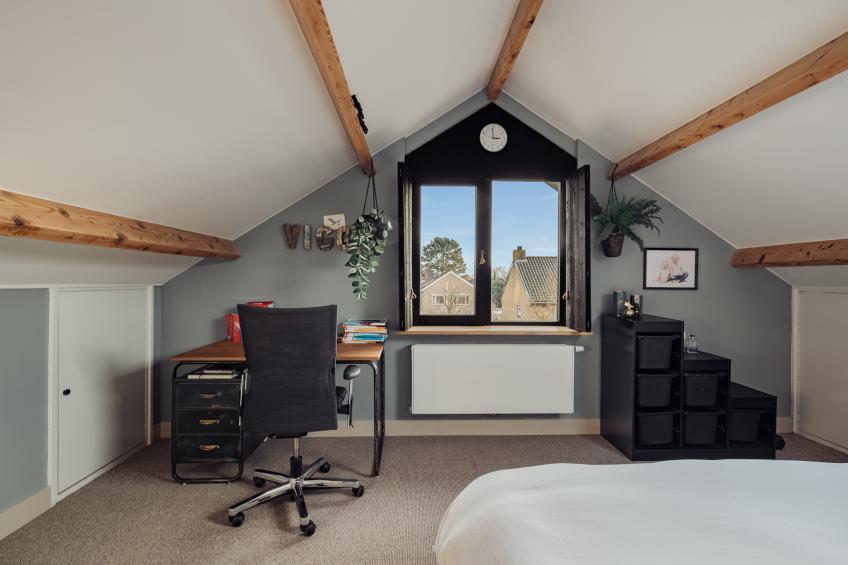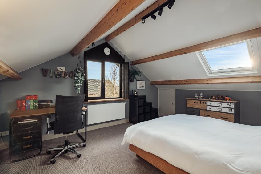 De eerste slaapkamer, gelegen aan de achterzijde van de woning, is van royaal formaat en beschikt over een groot dakraam dat zorgt voor veel natuurlijk licht. Vanuit hier heb je een mooi uitzicht op de achtertuin. Achter de knieschotten is extra veel bergruimte gecreëerd, waardoor deze kamer niet alleen ruim maar ook zeer praktisch is.