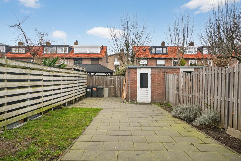 De woning beschikt over een achtertuin op het noordwesten en een voortuin op het zuidoosten, waardoor u op elk moment van de dag van de zon kunt genieten. De achtertuin is bereikbaar via een achterom en achterin de tuin bevindt zich een stenen schuur, ideaal voor het opbergen van fietsen, gereedschap of tuinmeubilair. Aan de voorzijde heeft de woning een vrij uitzicht op een speeltuintje en een groen plantsoen, wat zorgt voor een ruimtelijk en rustig gevoel. Daarnaast is er voldoende parkeergelegenheid direct voor de deur.