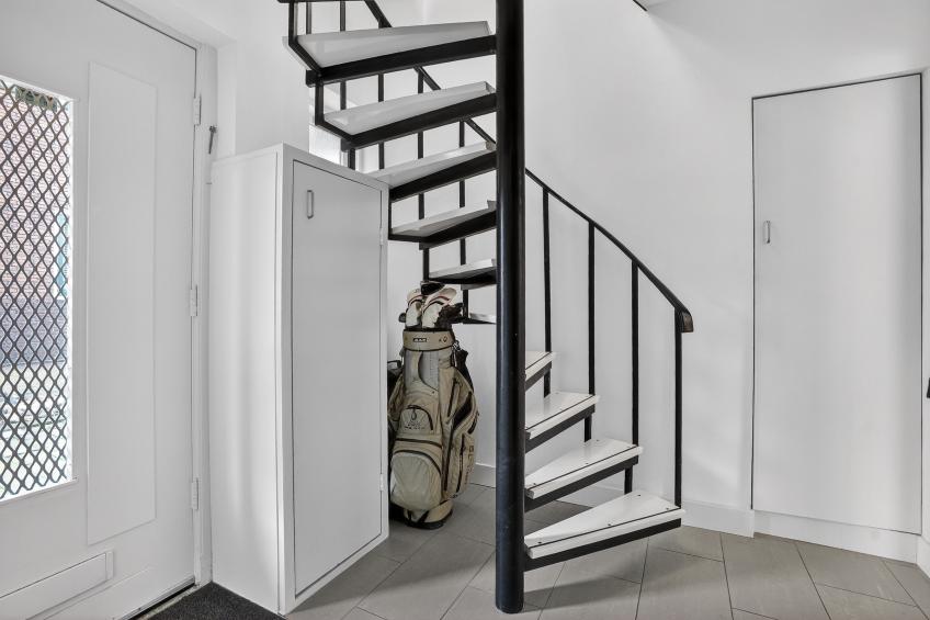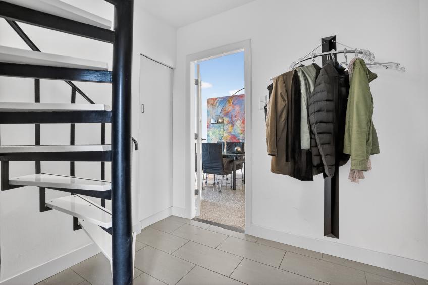 The stylish spiral staircase leads to the first floor. Here, you arrive at a spacious landing with a large window, providing plenty of natural light. The landing also houses a built-in cupboard with connections for the washing machine and dryer, finished with a black-and-white linoleum floor.