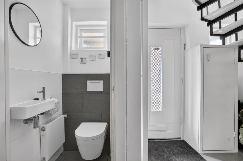 Through the stylish side entrance, you enter the hallway with a coat closet, which houses the meter cupboard and a modern toilet. The toilet is equipped with a wall-hung toilet and hand basin, finished in gray and white tiles. There is also a practical storage cupboard in the hallway.