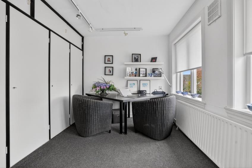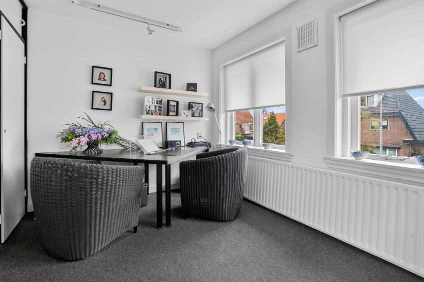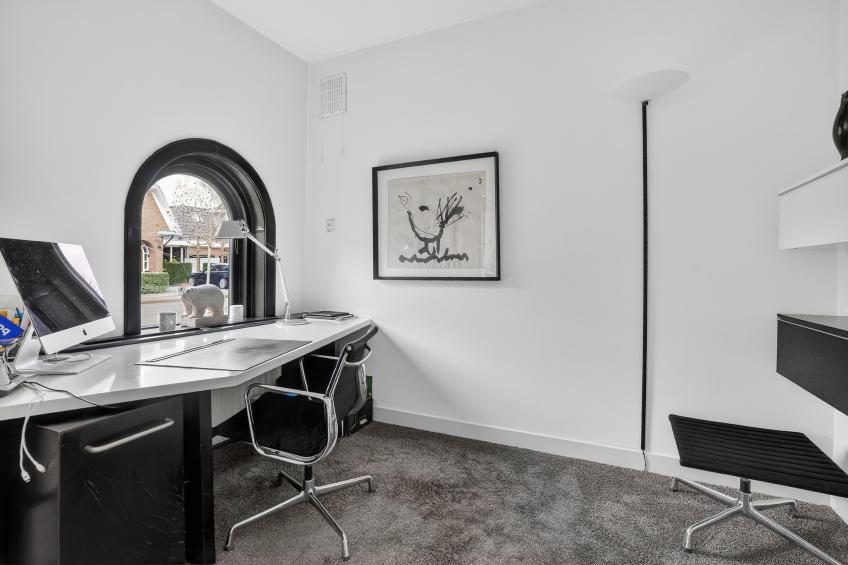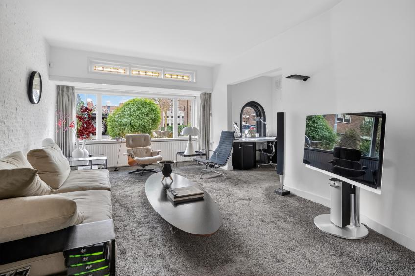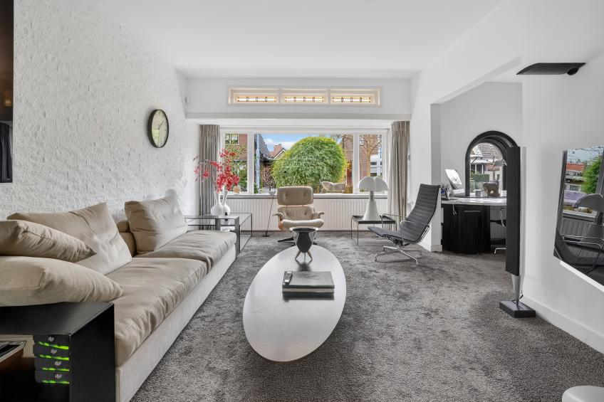 Vanuit de hal leidt een deur naar de woonkamer. De living is heerlijk licht en beschikt over een riant zitgedeelte. Een fraai detail zijn de glas-in-loodraampjes met daaraan grenzend een ensuite, die momenteel in gebruik is als kantoor. Aan de voorzijde bevindt zich een charmant ovaal raam met uitzicht op de straat.