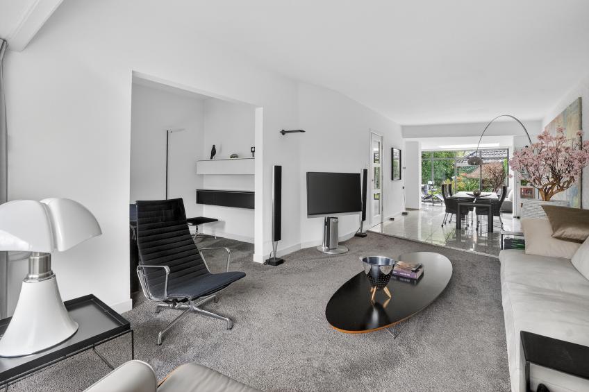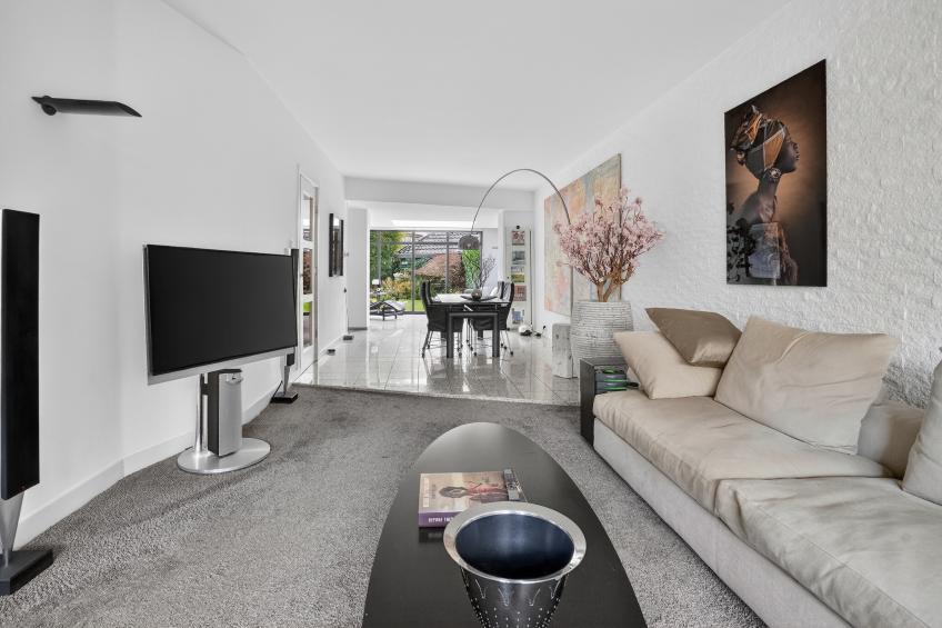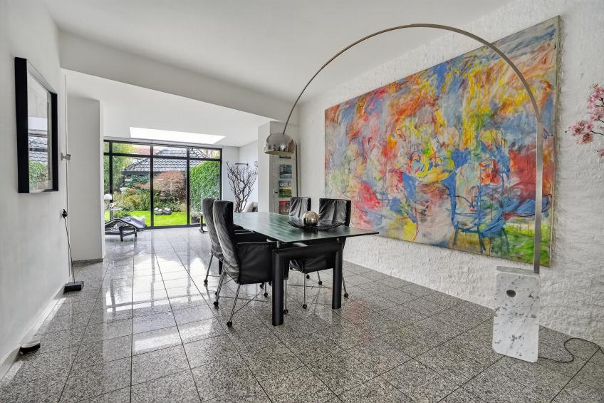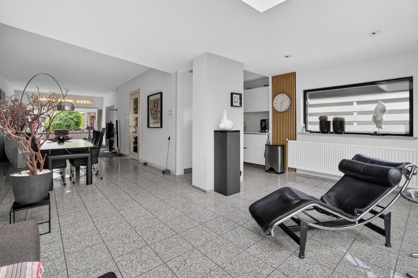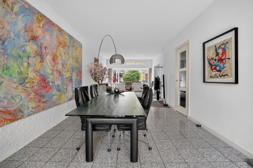 Het eetgedeelte biedt uitzicht op de zonnige achtertuin op het zuidoosten. Het uitgebouwde gedeelte is voorzien van een lichtkoepel, een grijs-witte tegelvloer met vloerverwarming en grote raampartijen tot aan de vloer, wat zorgt voor een prachtige lichtinval en een ruimtelijk gevoel.
