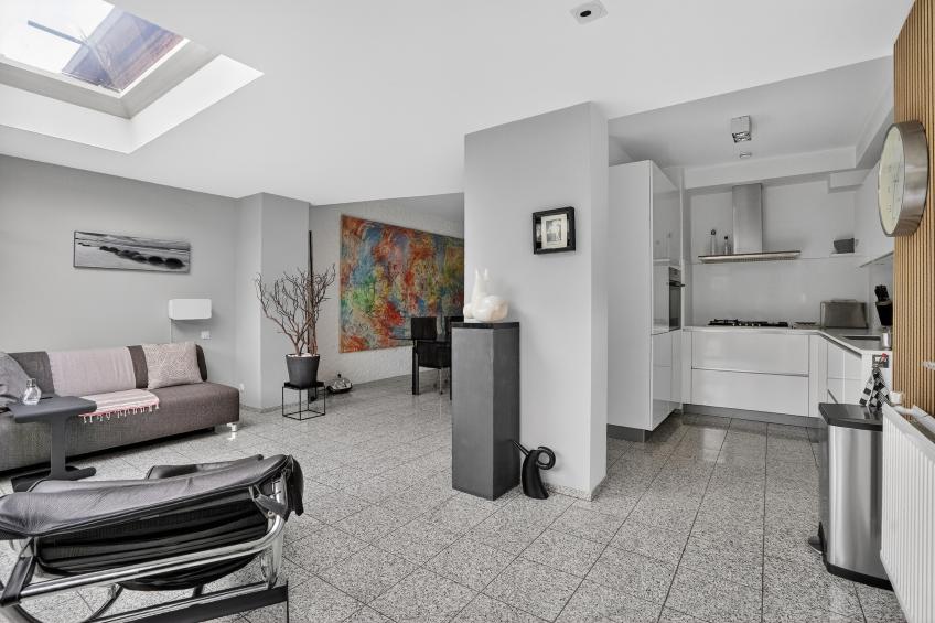 De halfopen keuken is modern, wit en greeploos uitgevoerd en voorzien van diverse inbouwapparatuur, waaronder een gaskookplaat met afzuigkap, oven, vaatwasser en een grote koelkast met vriesvak.