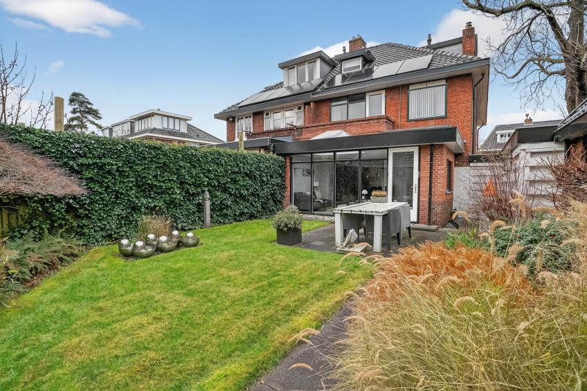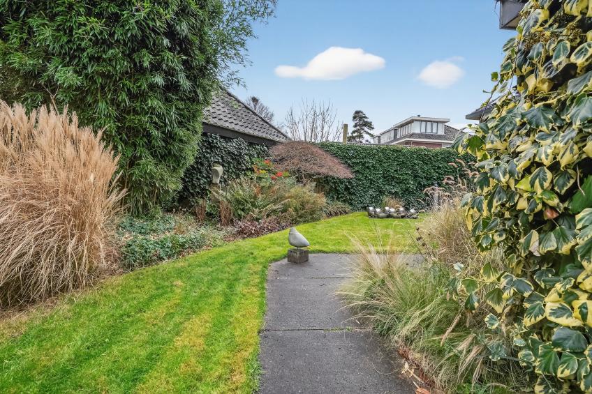 De zonnige achtertuin op het zuidoosten beschikt over een ruim terras en is rijk aan groen, waardoor je hier in alle rust van het buitenleven kunt genieten. De voortuin is fraai aangelegd en verzorgd, en vormt een uitnodigende entree die perfect aansluit bij het karakter van de woning.