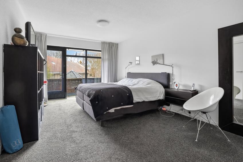 De eerste slaapkamer is aan de voorzijde van de woning gelegen en beschikt over een ensuite gedeelte met veel raampartijen en vaste kasten over de gehele lengte. Deze ruimte leent zich uitstekend voor bijvoorbeeld een walk-in closet, werkplek of kantoor aan huis.