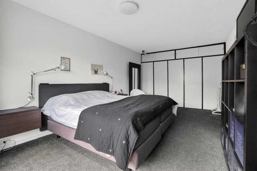 De tweede slaapkamer, momenteel in gebruik als master bedroom, bevindt zich aan de achterzijde en heeft toegang tot een balkon met uitzicht over de achtertuin. Ook hier zijn over de volledige lengte vaste kasten aanwezig. Beide slaapkamers zijn voorzien van grijze vloerbedekking.