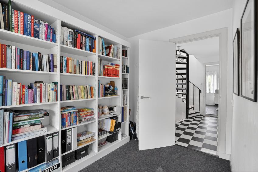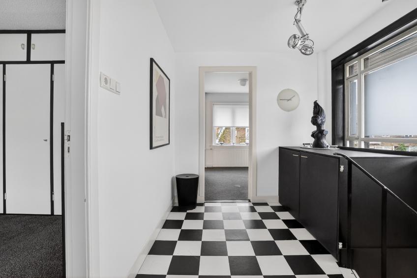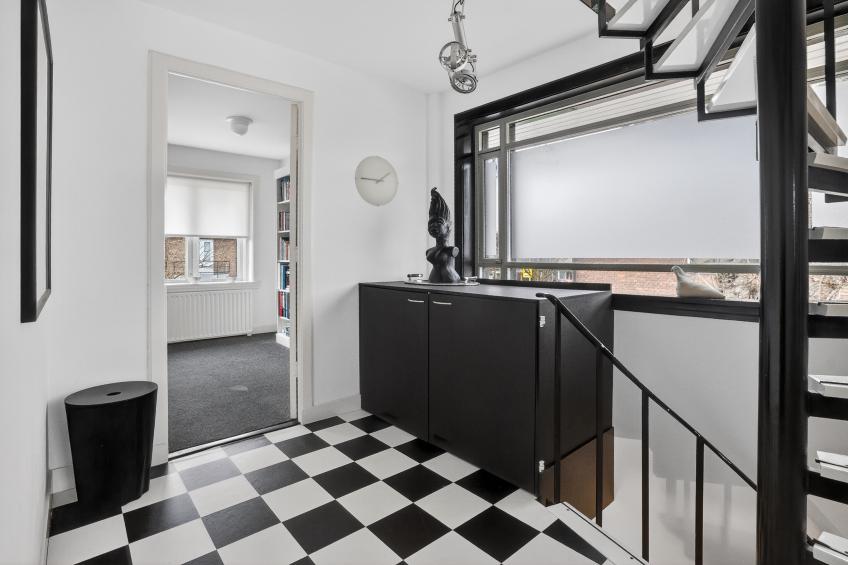 Via de stijlvolle wenteltrap bereik je de eerste verdieping. Hier kom je uit op een ruime overloop met een groot raam, wat zorgt voor veel daglicht. Op de overloop bevindt zich tevens een vaste kast met opstelling voor de wasmachine en droger, afgewerkt met een zwart-witte zeilvloer.
