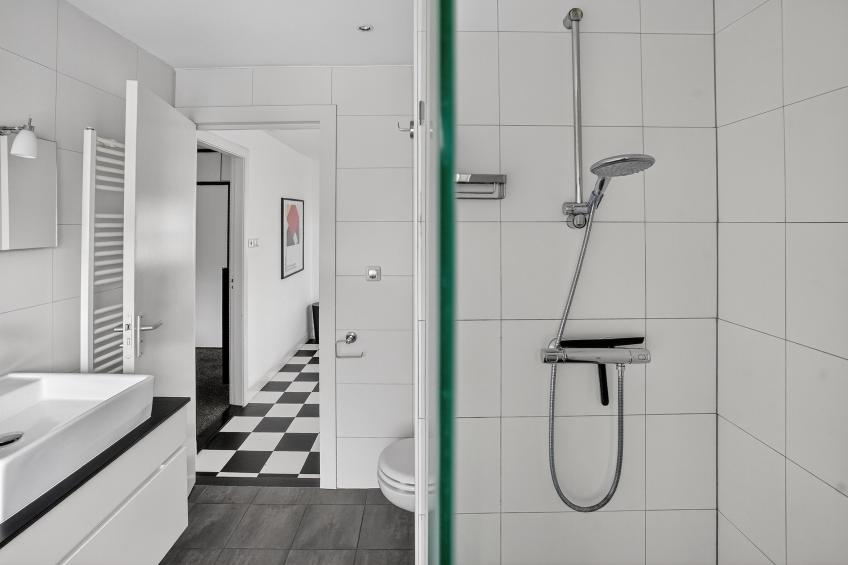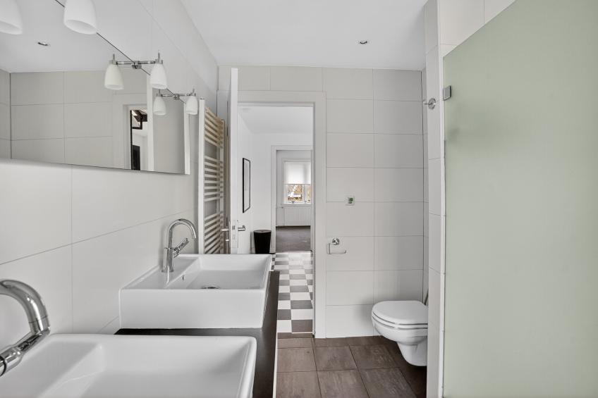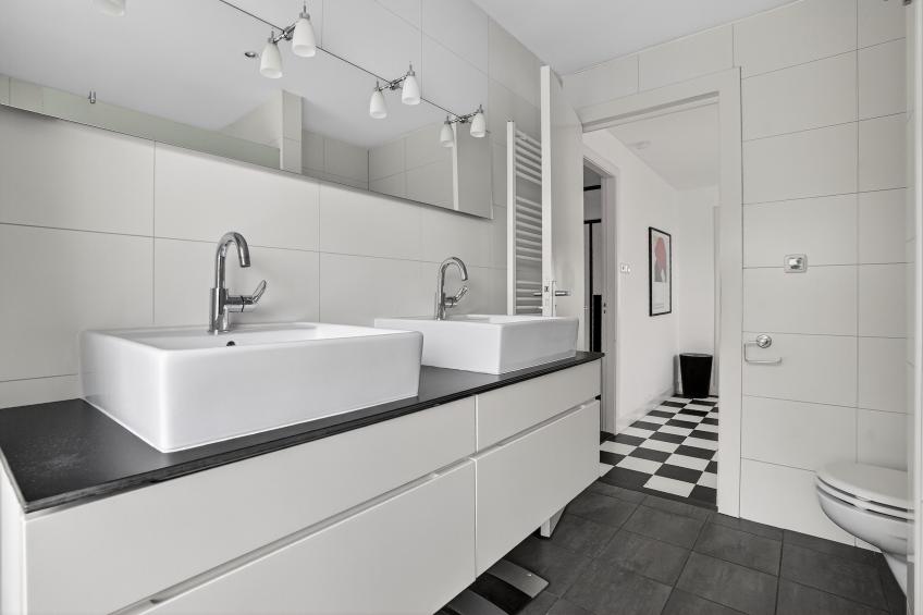 De badkamer is compleet uitgevoerd met een ruime inloopdouche, een dubbele wastafel met zwevend meubel, een toilet, vloerverwarming en een designradiator. Dankzij het raam profiteert de badkamer van prettig daglicht en natuurlijke ventilatie. De moderne kleurstelling in grijze en witte tegels zorgt voor een frisse en tijdloze uitstraling.