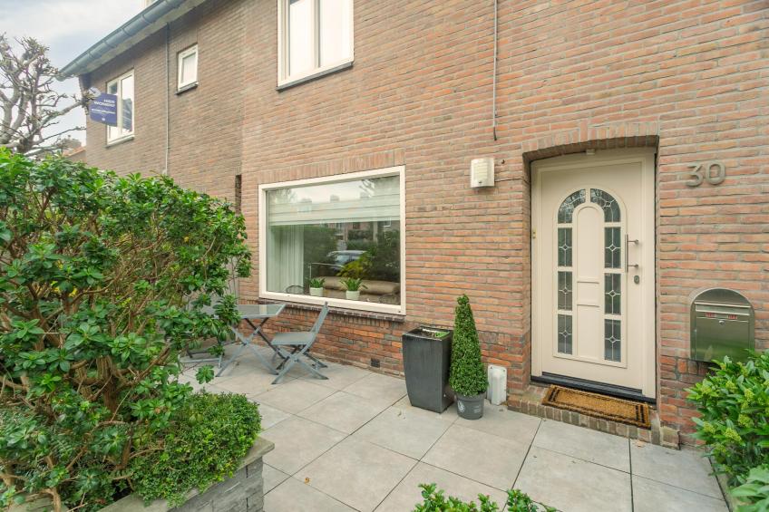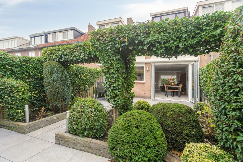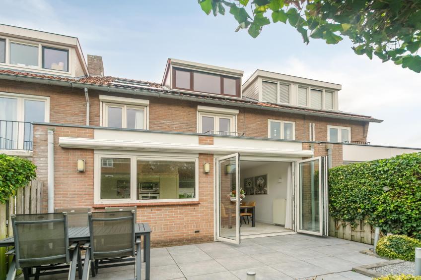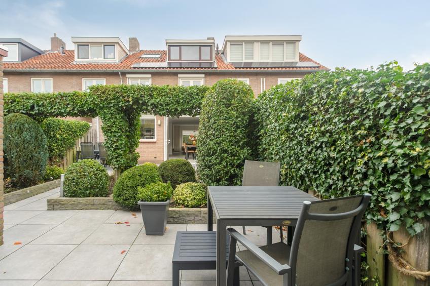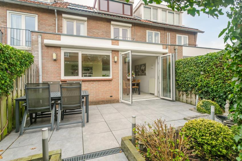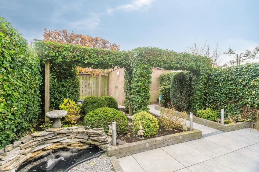 The backyard faces the sunny southeast and offers a pleasant mix of greenery and elegant patio tiles. Thanks to the electric awning, you can sit comfortably here, even on warm days. At the back of the garden is a spacious shed and there is convenient rear access.
