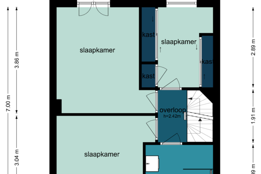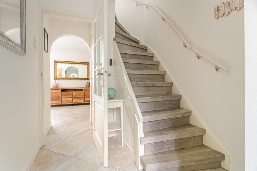 Via de eveneens met houtlook beklede vaste trap kom je op de tweede verdieping.