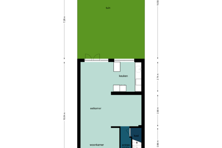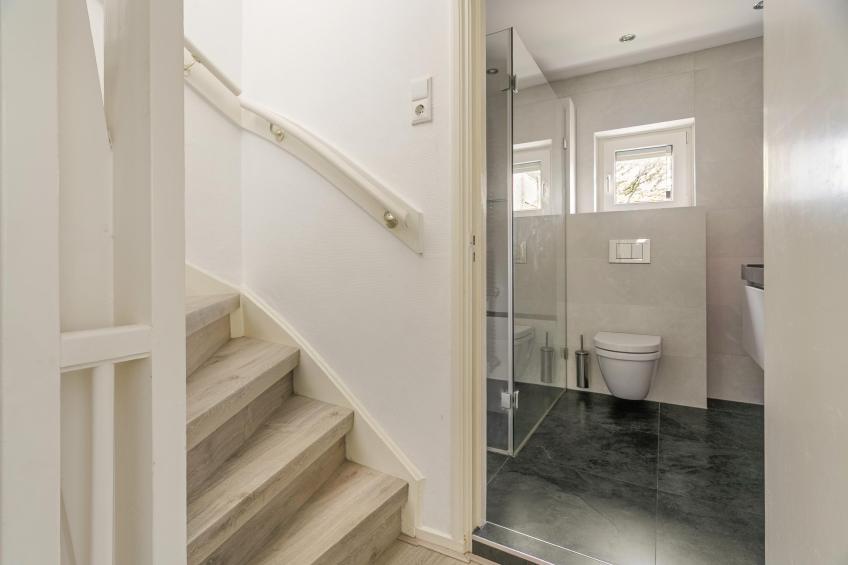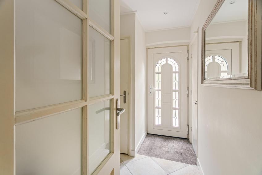Je komt binnen in de hal met meterkast, een moderne toiletruimte met zwevend toilet, een handige trapkast en toegang tot de woonkamer.