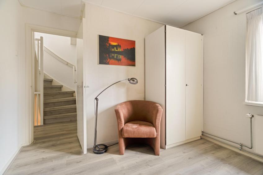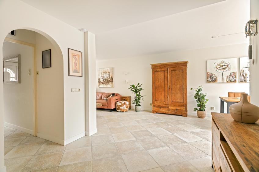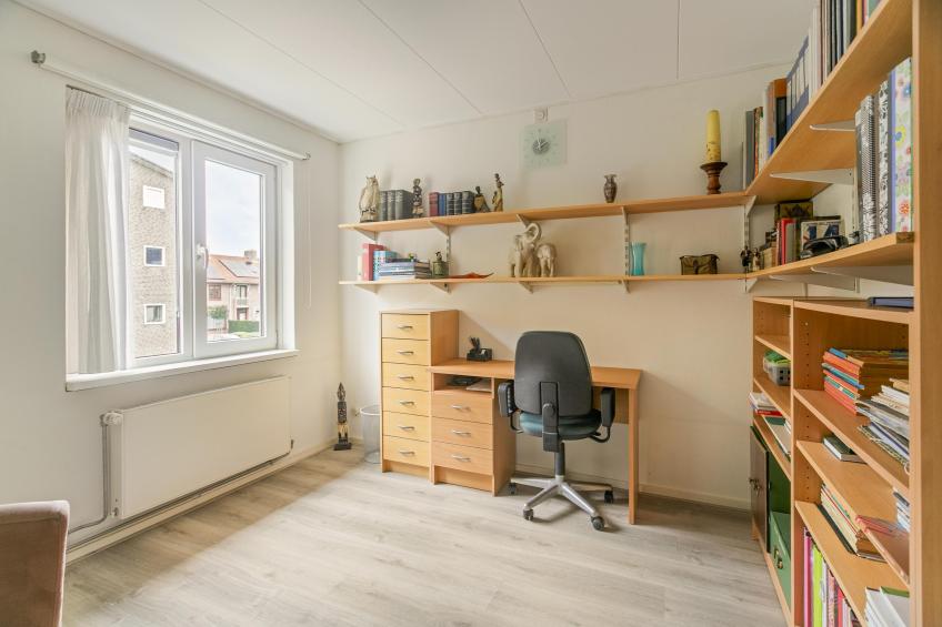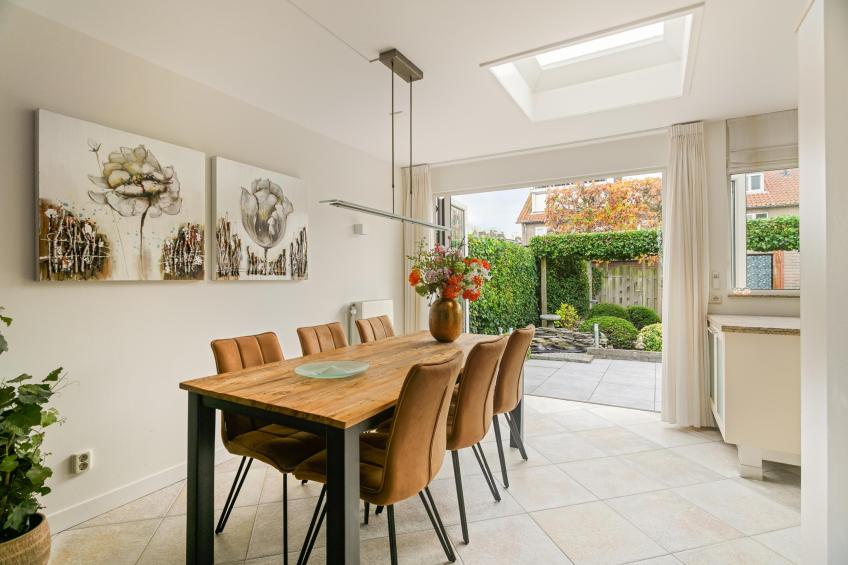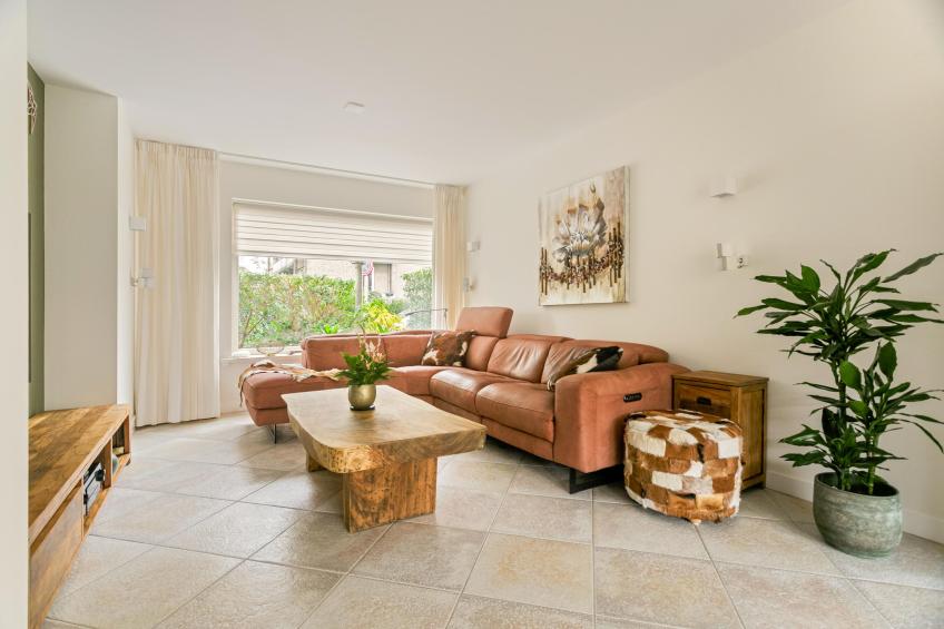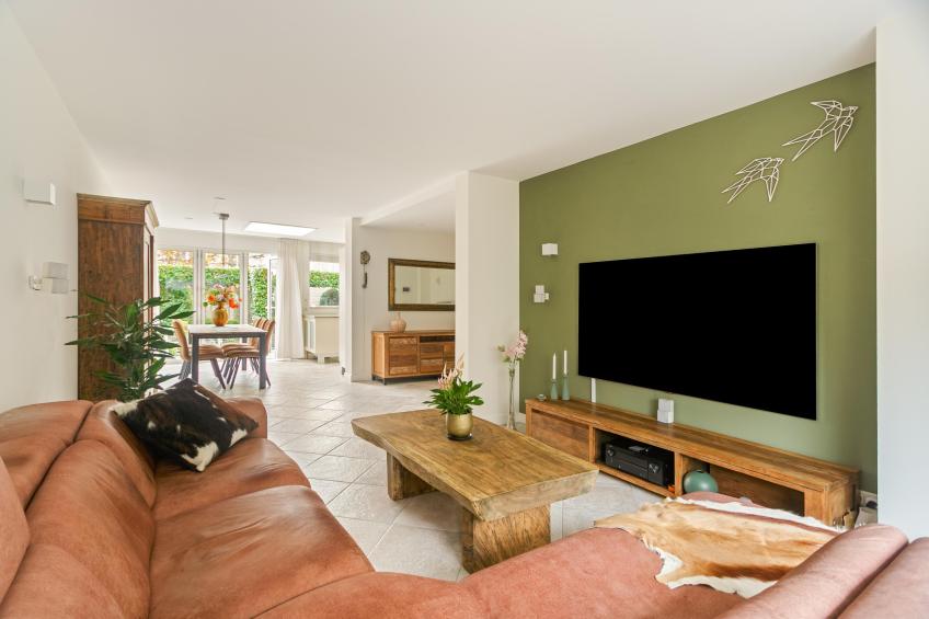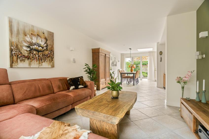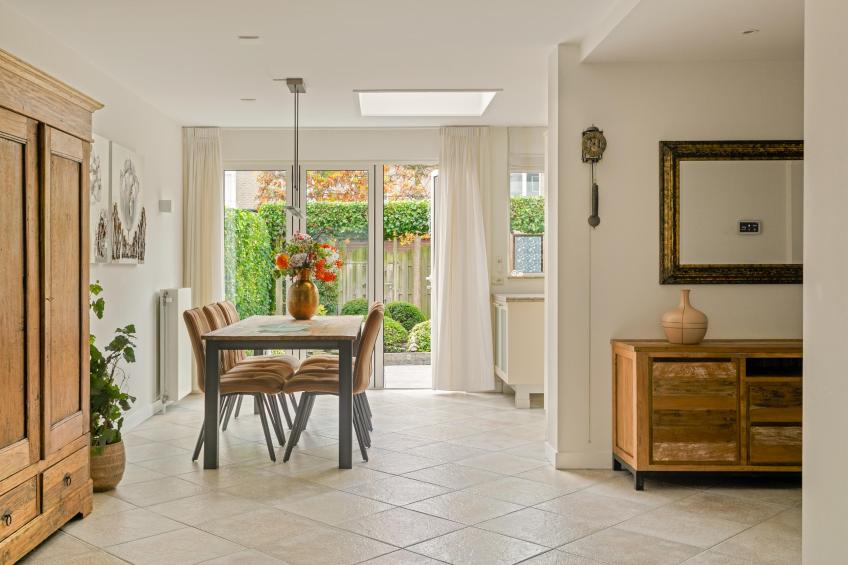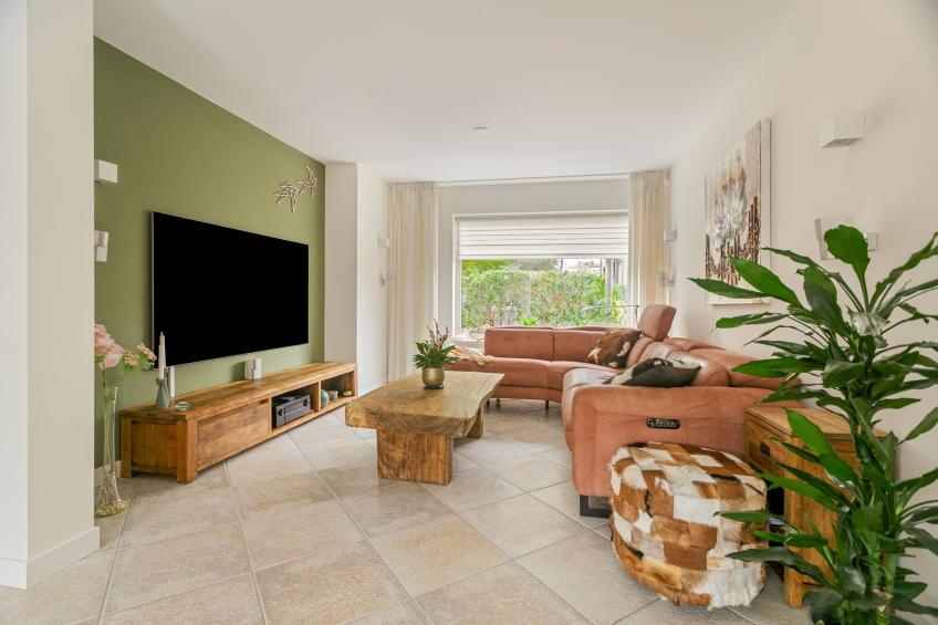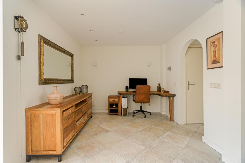 De ruime woonkamer is ingedeeld met een zitgedeelte aan de voorzijde en een aparte kantoorruimte – ideaal voor thuiswerken. In de uitbouw aan de achterzijde vind je het eetgedeelte en de open keuken. De plavuizen vloer met comfortabele vloerverwarming en strak gestucte wanden zorgen voor een verzorgde en eigentijdse uitstraling.