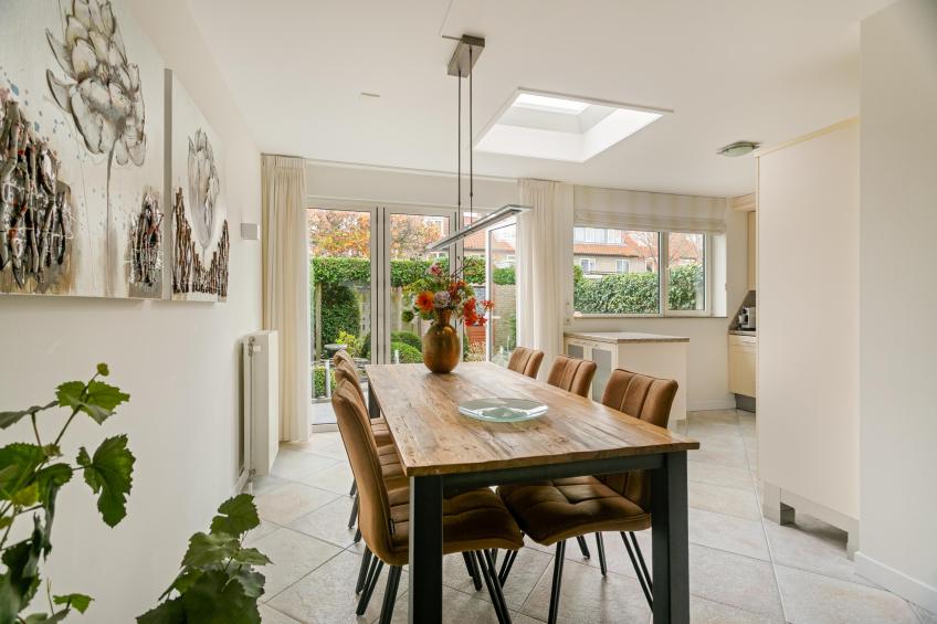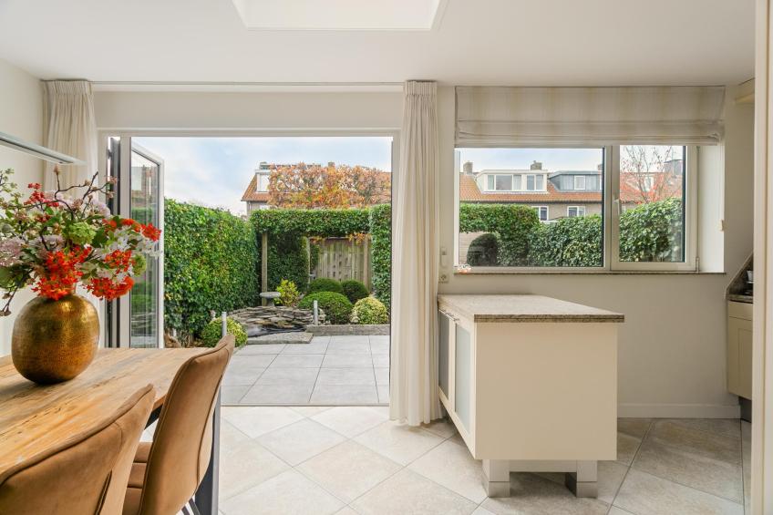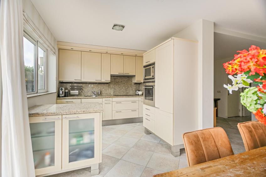 De open keuken is uitgevoerd in crèmekleurige fronten met een luxe marmeren werkblad. Aan inbouwapparatuur is geen gebrek: een Siemens oven, magnetron, Miele vaatwasser en Atag inductiekookplaat maken koken een genot. De lichtkoepel en de volledig te openen schuifpui zorgen voor veel daglicht en een prachtige verbinding tussen binnen en buiten.