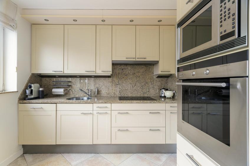 The open-plan kitchen features cream-colored fronts and a luxurious marble countertop. Built-in appliances abound: a Siemens oven, microwave, Miele dishwasher, and Atag induction cooktop make cooking a pleasure. The skylight and the fully opening sliding doors provide plenty of daylight and a beautiful connection between inside and outside.