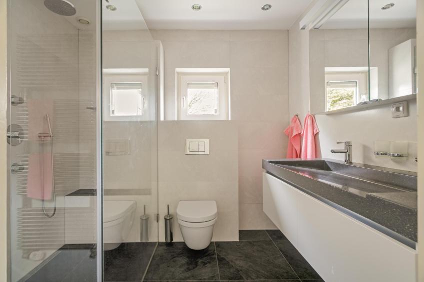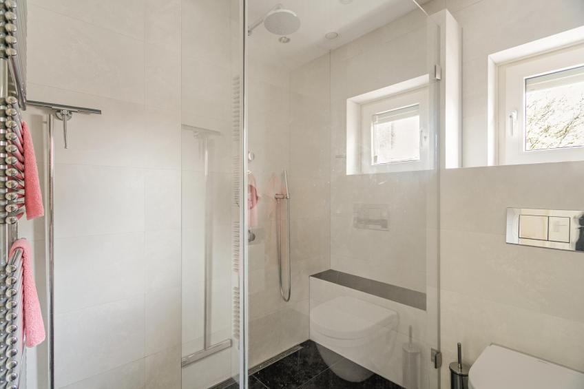 De badkamer is stijlvol en modern afgewerkt met grijs/beige betegeling, vloerverwarming, ruime inloopdouche (regen- en handdouche), tweede toilet, dubbele wastafel met meubel en spiegelkast. Het raam zorgt voor prettig daglicht en natuurlijke ventilatie.