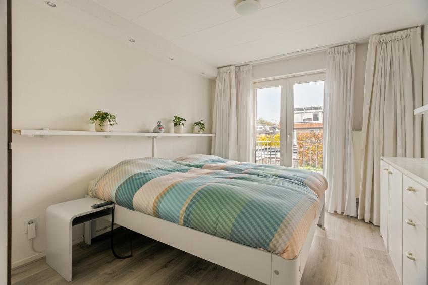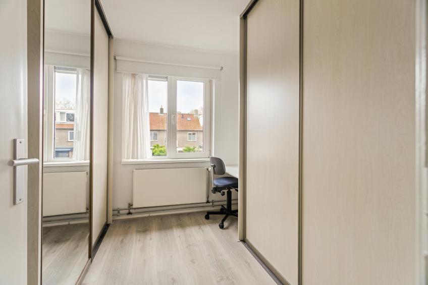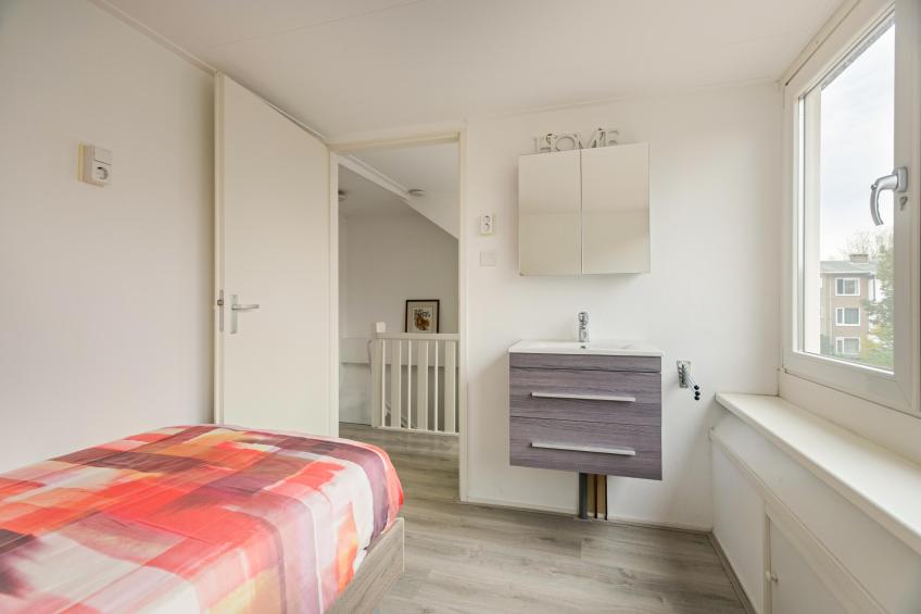 De slaapkamer aan de voorzijde is voorzien van een wastafel, spiegelkast, vaste bergruimte en elektrisch bedienbare rolluiken. De tweede kamer is in gebruik als hobbyruimte. Desgewenst kunnen deze kamers samengevoegd worden tot één royale slaapkamer.