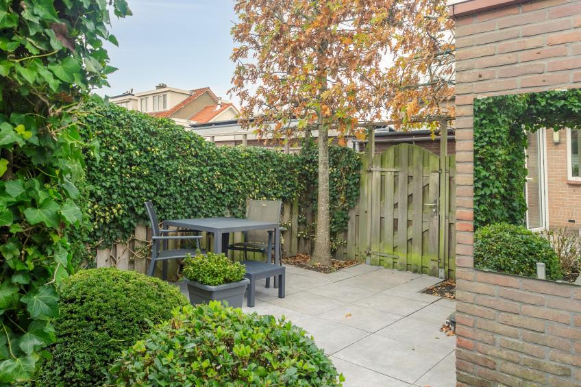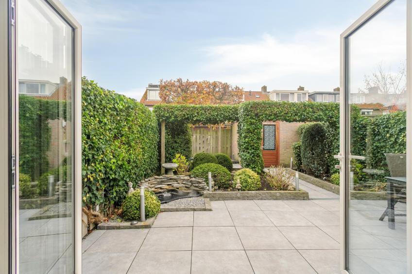 De achtertuin is gelegen op het zonnige zuidoosten en biedt een fijne afwisseling van groen en sierlijke terrastegels. Dankzij het elektrisch bedienbare zonnescherm zit je hier comfortabel, ook op warme dagen. Achterin de tuin bevindt zich een ruime schuur en er is een handige achterom aanwezig.